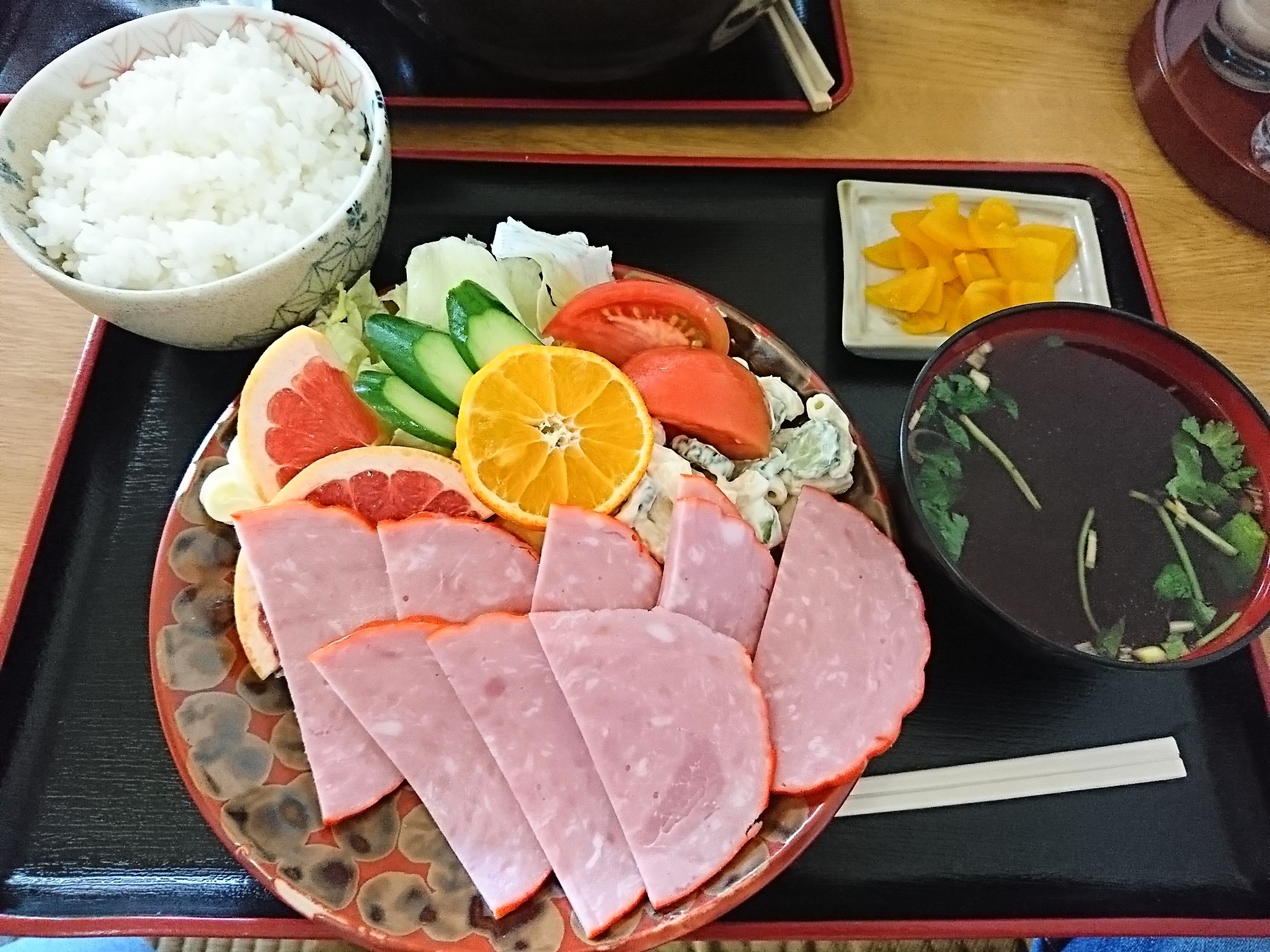 今日、食べたのはハムライス(650円)です。ハムライスは昔懐かし〜い、食品添加物いっぱいのスライスされた赤ハムが10枚とマカロニサラダに生野菜・果物が少々、そしてご飯にスープ・漬物が付いています。味も懐かしい味わいで、マヨネーズをつけてご飯と一緒に食べると美味しいですねぇ〜 食べててなんか外食のメニューって言うより、素朴な家庭の朝食って感じがしましたが、そこがまた今となっては少ない昭和の食堂ならではでメニューでいいですね! 野菜豊富で栄養バランスも良く美味しかったです。ごちそうさまでした。^^