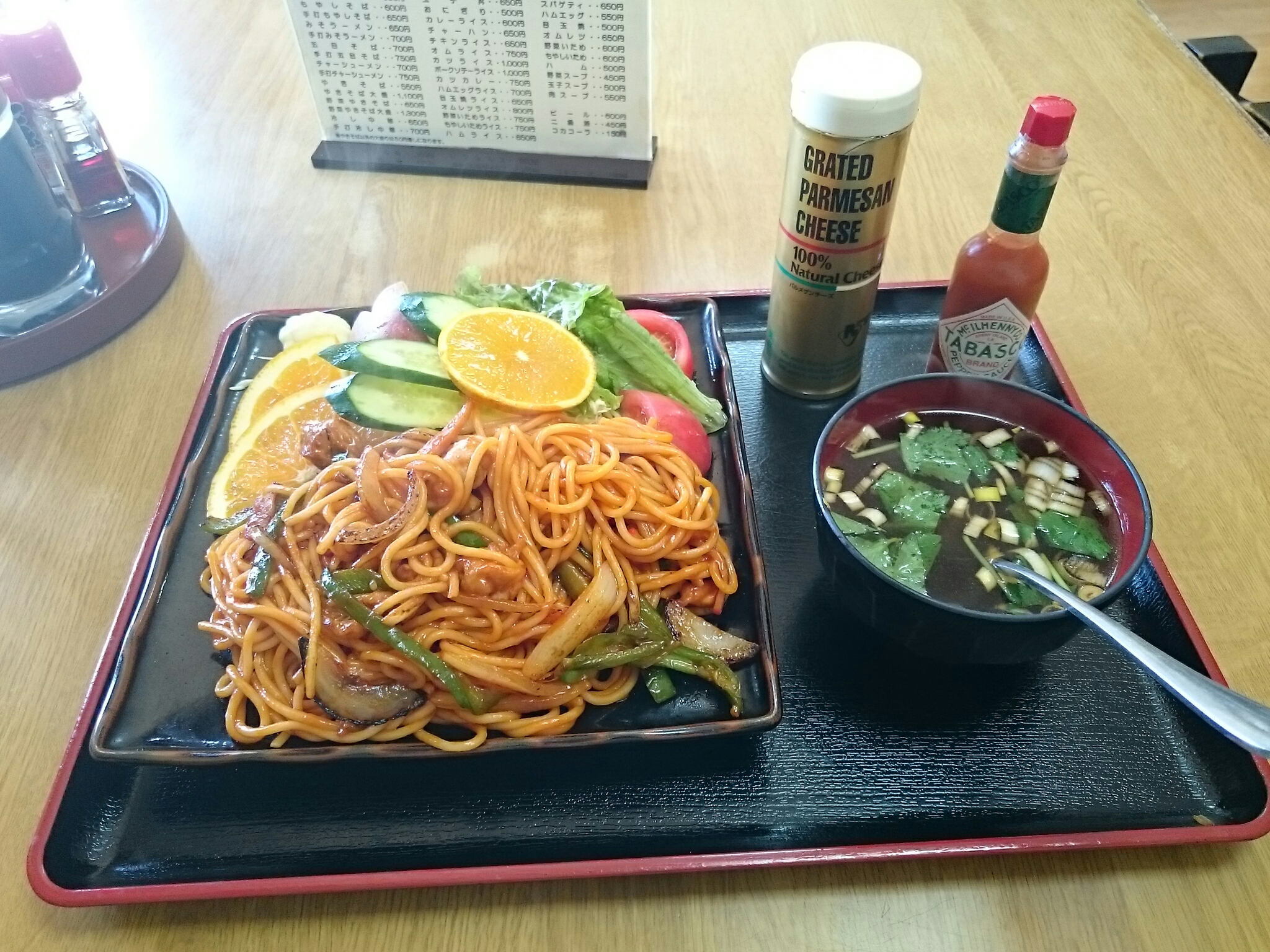 今日、食べたのはスパゲティ(650円)です。具多めの昔ながらのナポリタンで、甘酸っぱい味わいで旨味もあって美味しかったです。またトマト・レタス・キュウリ・キャベツのたっぷりの生野菜とリンゴとオレンジのフルーツも付いているので食べ応えがあり、野菜もたくさん食べれるので、日頃野菜が不足がちの方にはお勧めですね。