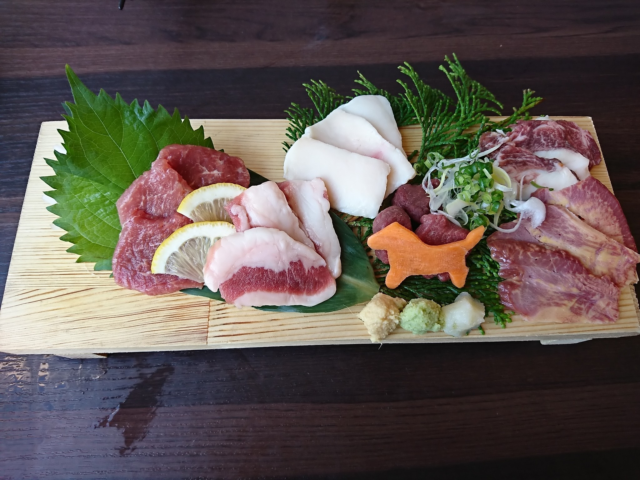 一品目は馬刺し5点盛りを注文しました。ロースにヒレ・フタエゴ・タテガミ・馬タンの5種類ですが、今日はサービスで部位は忘れましたが、もう1部位入れてくれました。どれも新鮮で美味しく最高でした!