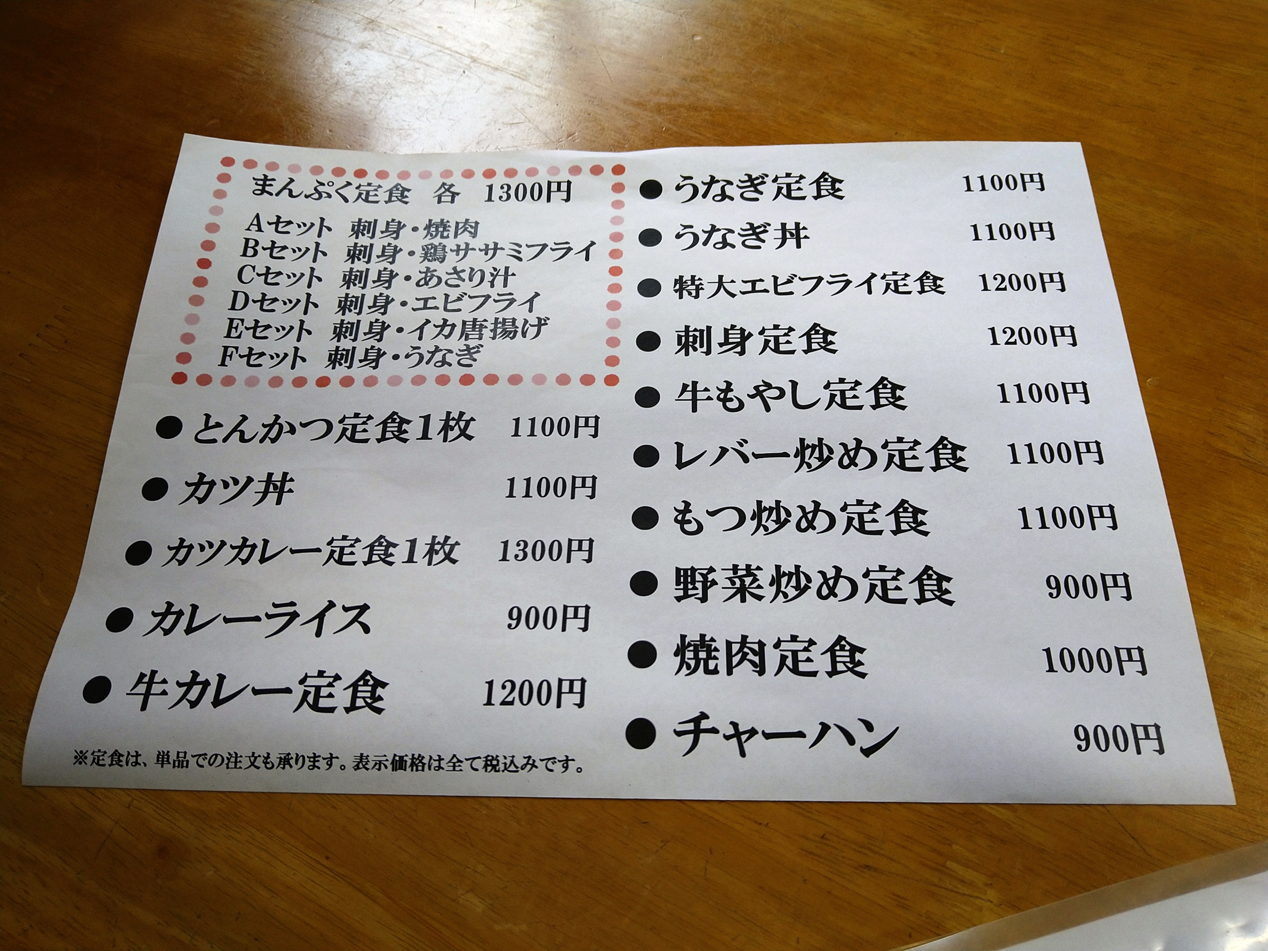 まんぷく定食をはじめ定食類が充実していて、丼物やカレーチャーハンもありますが、4年前に私が食べた刺身大盛定食は無くなっていました。