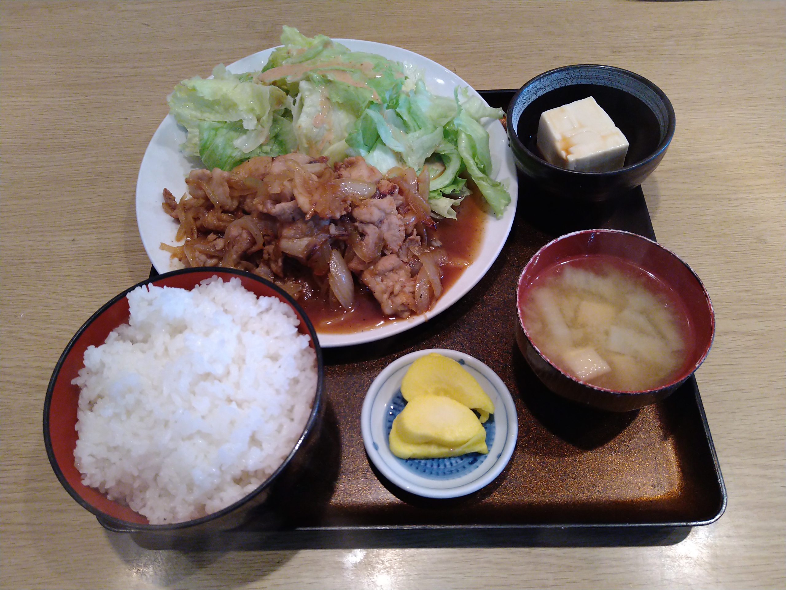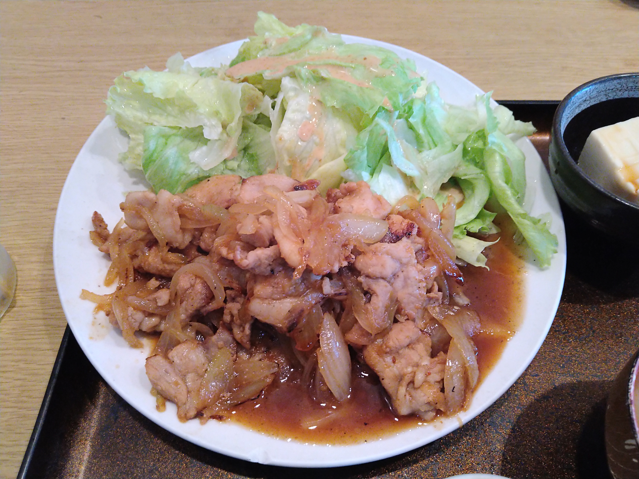 私が注文したのは焼肉定食(1050円)です。焼肉定食の焼肉は豚の生姜焼きでご飯に小鉢ラーメン・ポテトサラダ・漬物が付いています。結構ボリュームがあって甘めの味付けの生姜焼きが美味しくご飯がすすみました。