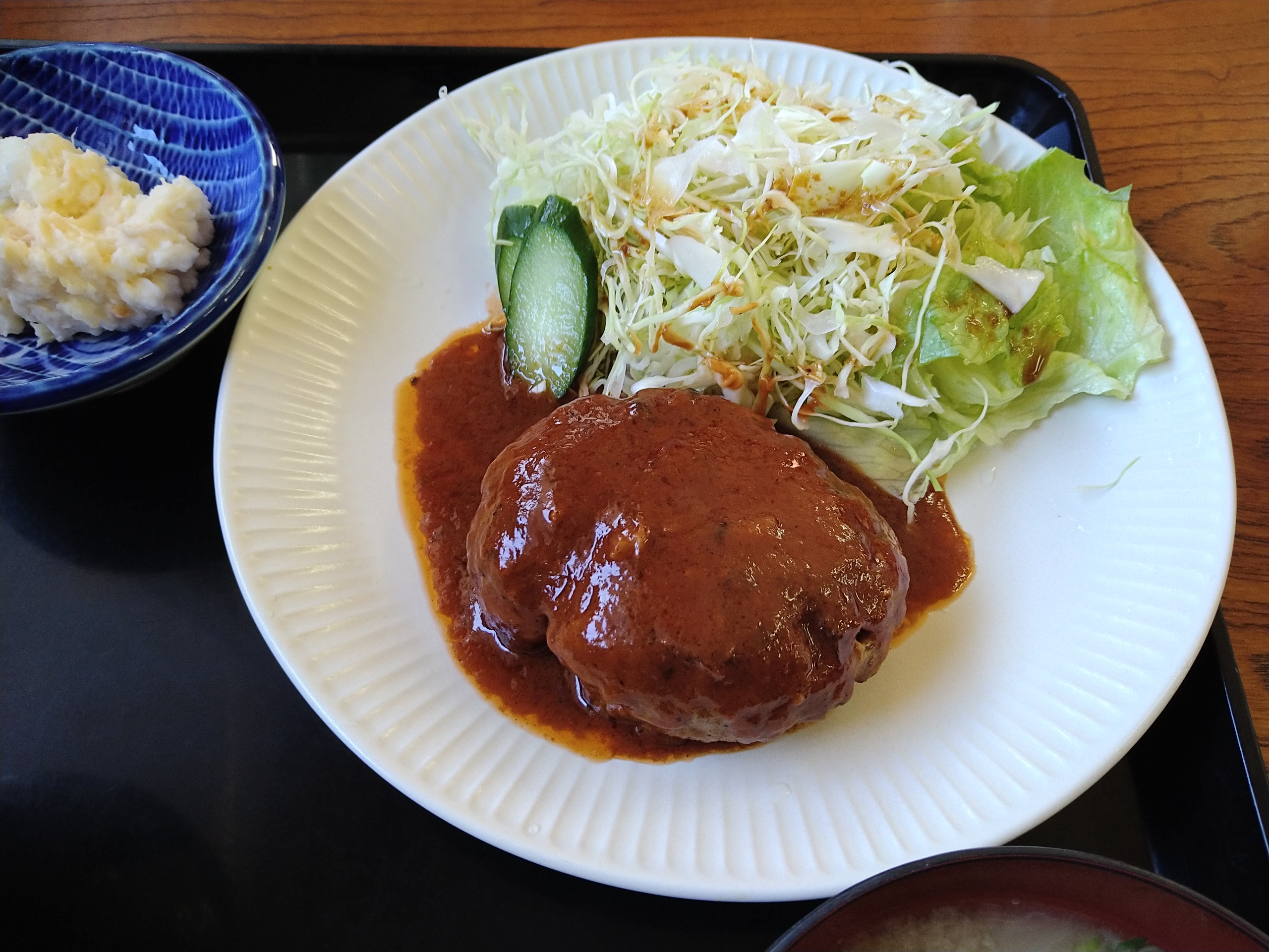 本日のおすすめのカマス塩焼き定食も気になって食べたかったが、ボリュームのある人気商品と書かれていたハンバーグ定食が気になったのでハンバーグ定食(970円)を注文しました。ハンバーグ定食は手造りのハンバーグに生野菜・ご飯・味噌汁・ポテトサラダ・漬物が付いていますが、ハンバーグが思ってたほど大きくなくてあまりボリュームがある感じはしませんでした。