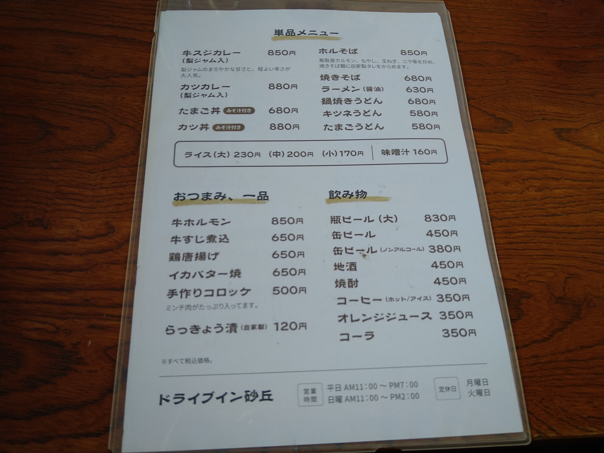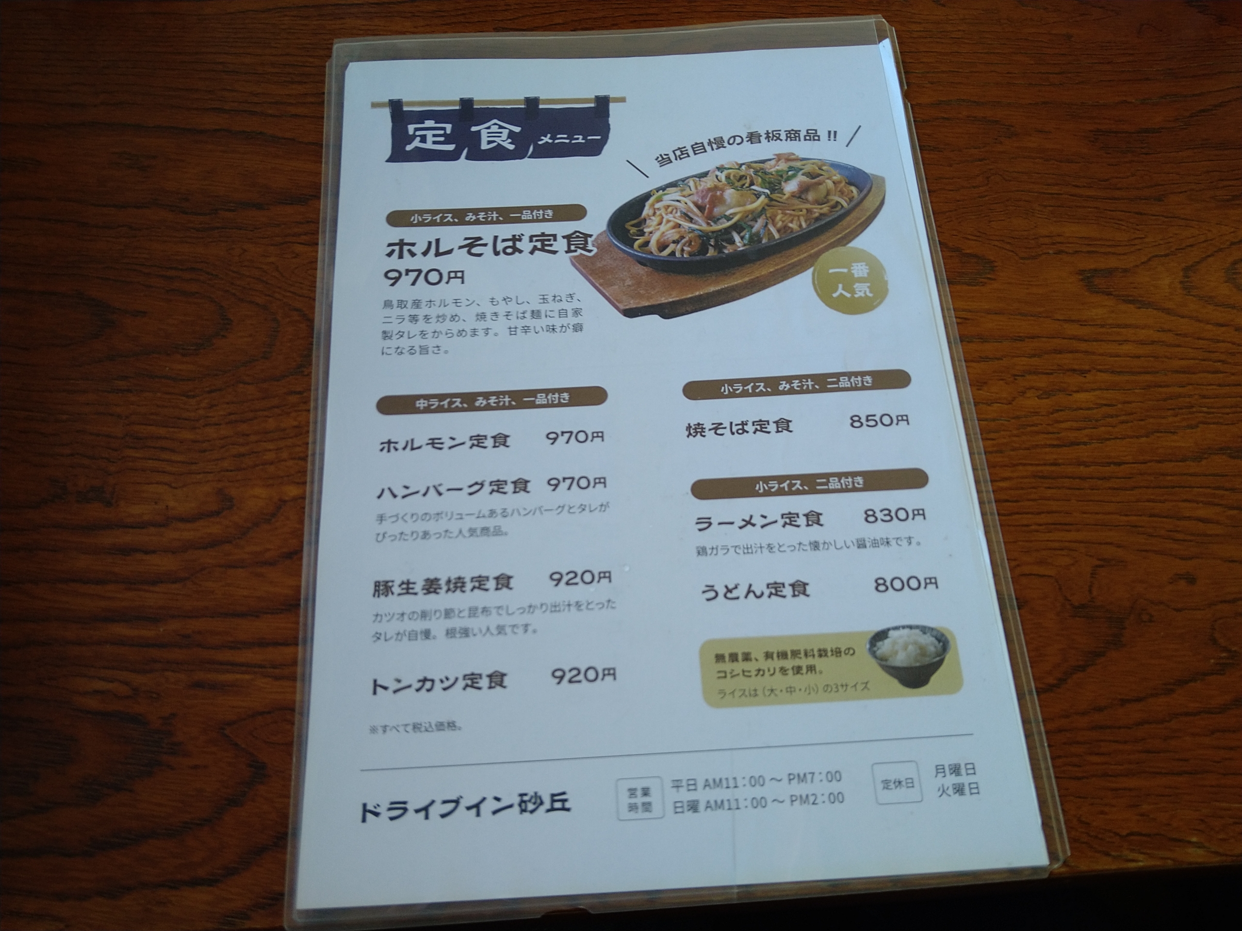 お店のメニューです。ドライブイン砂丘はB級グルメのホルそばことホルモン焼きそばが一番のウリで名物でもあります。前回訪れた時はホルそばを食べました。