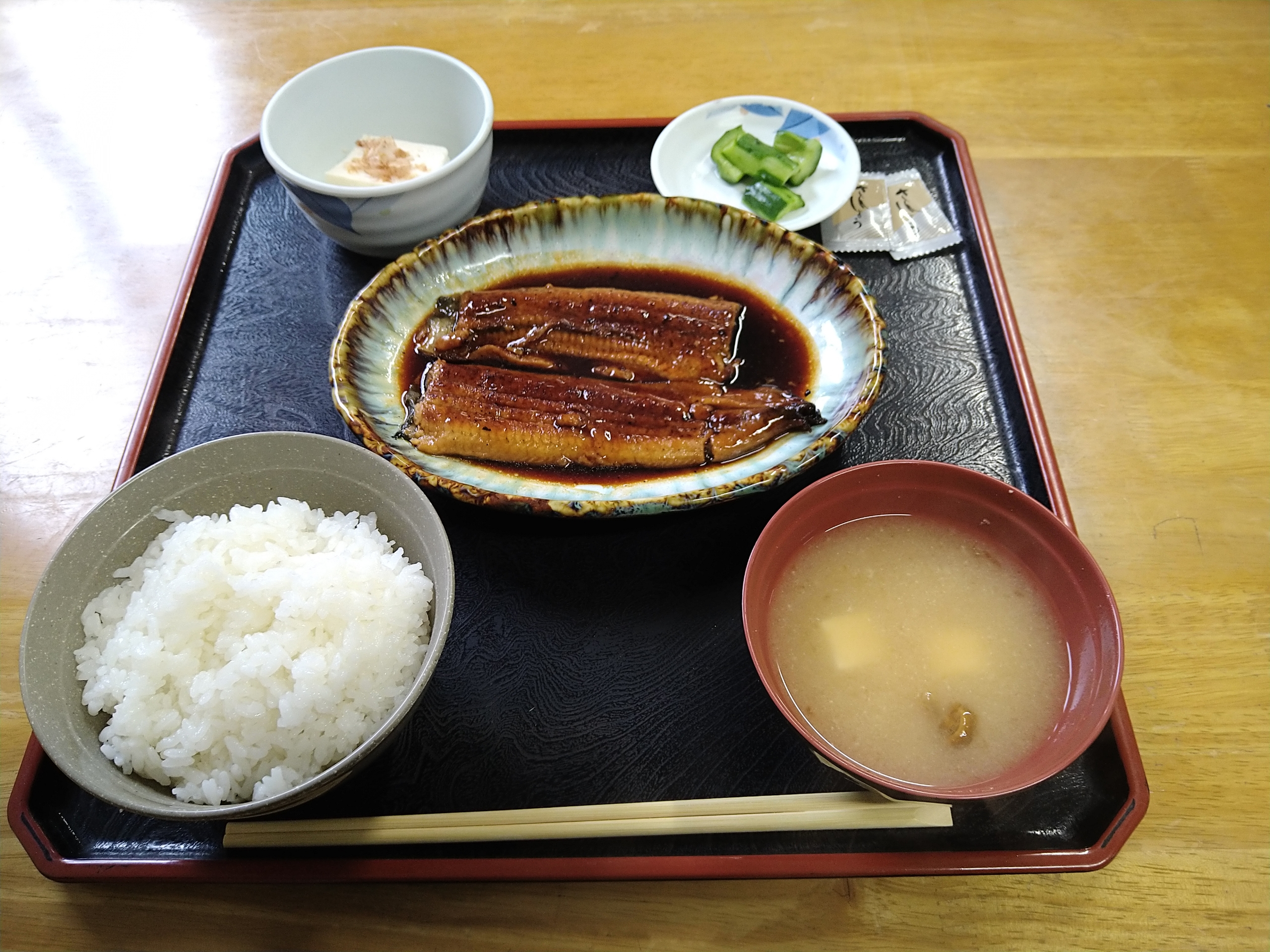 ドライブインまんぷくに行った10月20日は秋の土用が始まる日だったのでうなぎ定食(1100円)を注文しました。 うなぎ定食は小振りの鰻の蒲焼きにご飯・味噌汁・冷奴・漬物が付いています。