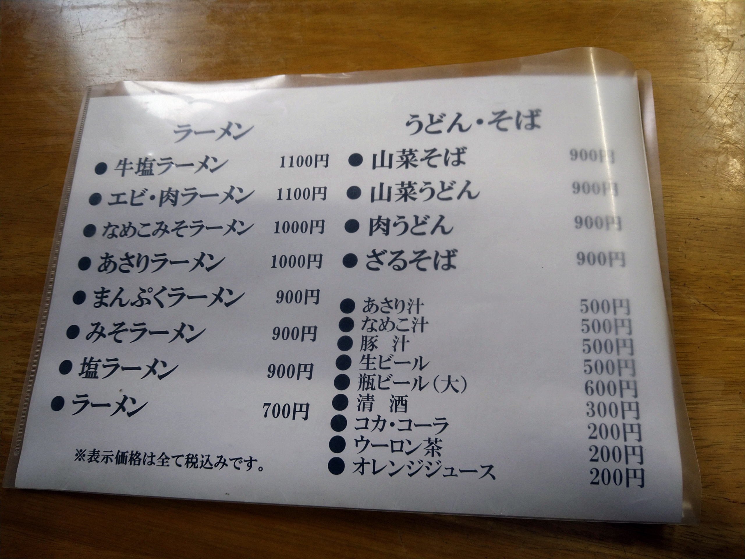 メニューです。麺類はラーメンにうどん・そばがあり、セットメニューもありました。単品料理も充実しています。