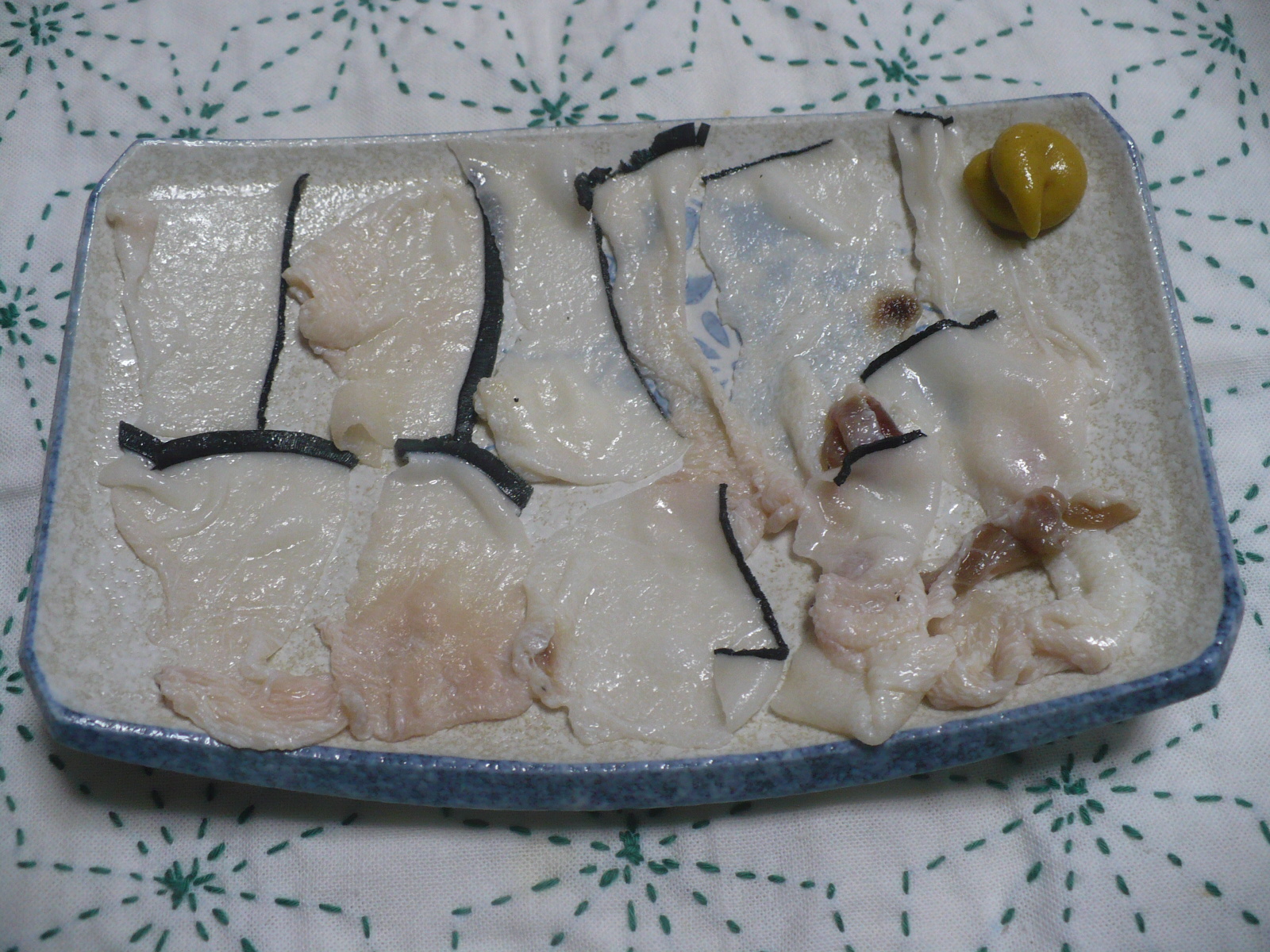 畝は湯引きで食べるのが一般的らしいが、今回は生でもいけるらしいので、カラシ醤油で生で食べました。食べた感想はクニュクニュとしていて脂っぽいので、一般的な湯引きがベストですね。残り半分は湯引きで食べてみたいと思います。