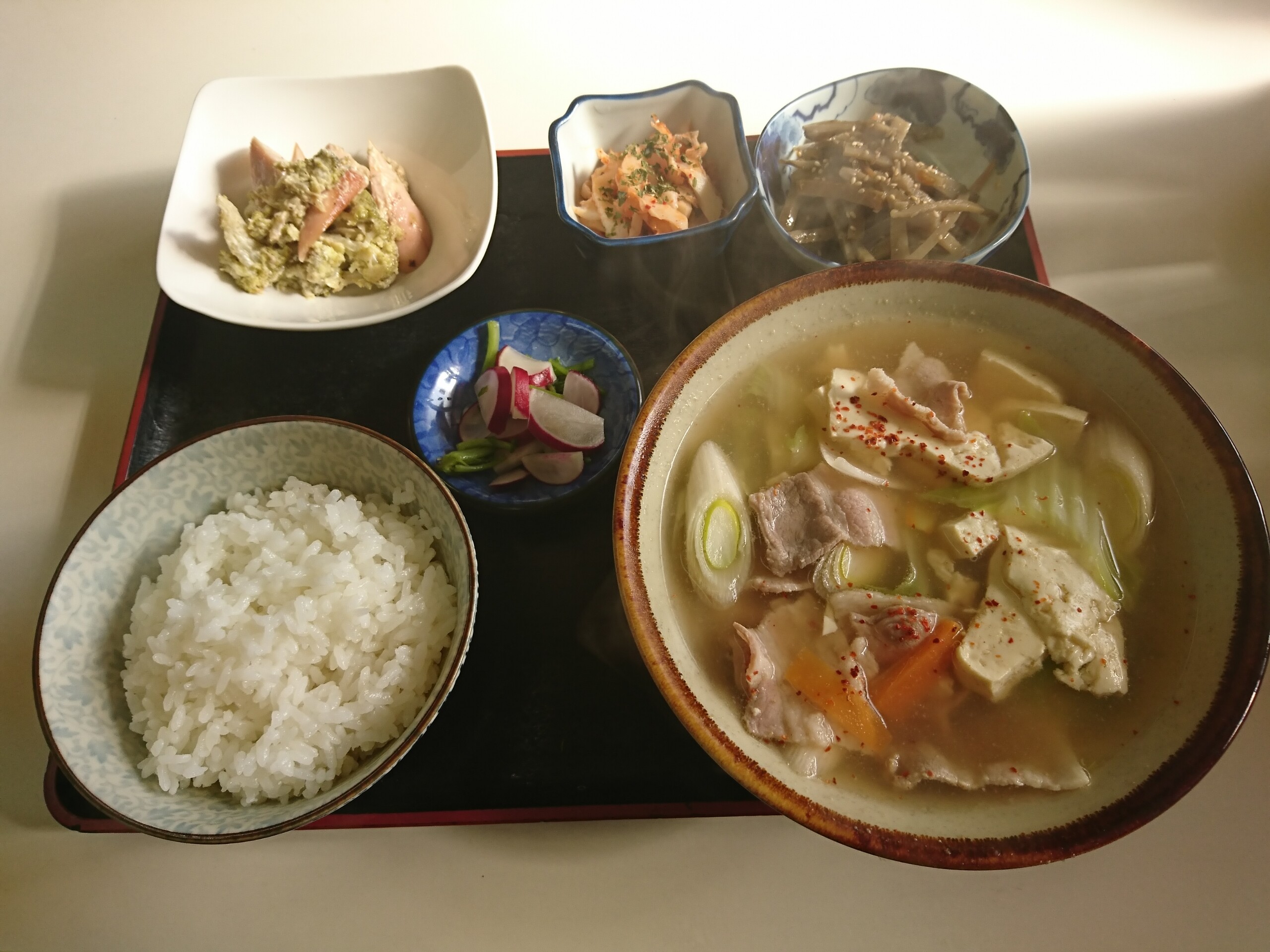 私に大好きな肉鍋定食はメニューに無かったので今日は肉汁定食(700円)を食べました。肉汁とは豚汁の事で豚汁定食ですね。肉汁定食は肉汁にご飯・小鉢3品と赤カブの漬物が付いていました。小鉢はブロッコリーとソーセージをドレッシングで和えたものとちくわとネギとキムチを和えたもの、そしてきんぴらごぼうでした。どれも手作りのおふくろの味って感じで美味しかったです。肉汁は豚肉に豆腐・白菜・ネギ・人参が入っててボリュームもあって薄めのやさしい味噌味で美味しかったです。また店のおばちゃんがご飯のおかわりも無料で勧めてくれました。