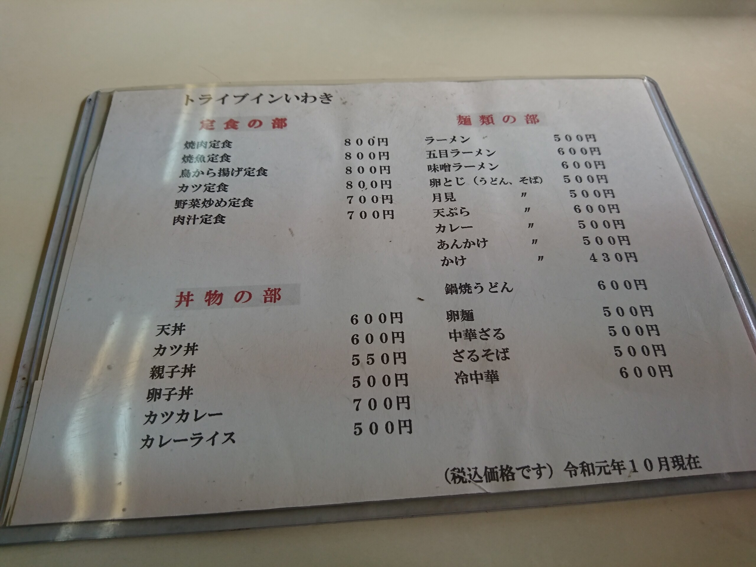 店内の感じは狭い店内にお客さんが居たので撮れませんでした。テーブル席4席に使われてなさそうな座敷に1席ありました。メニューは麺類・丼物・定食がありちょっと選択肢が少なくシンプルです。