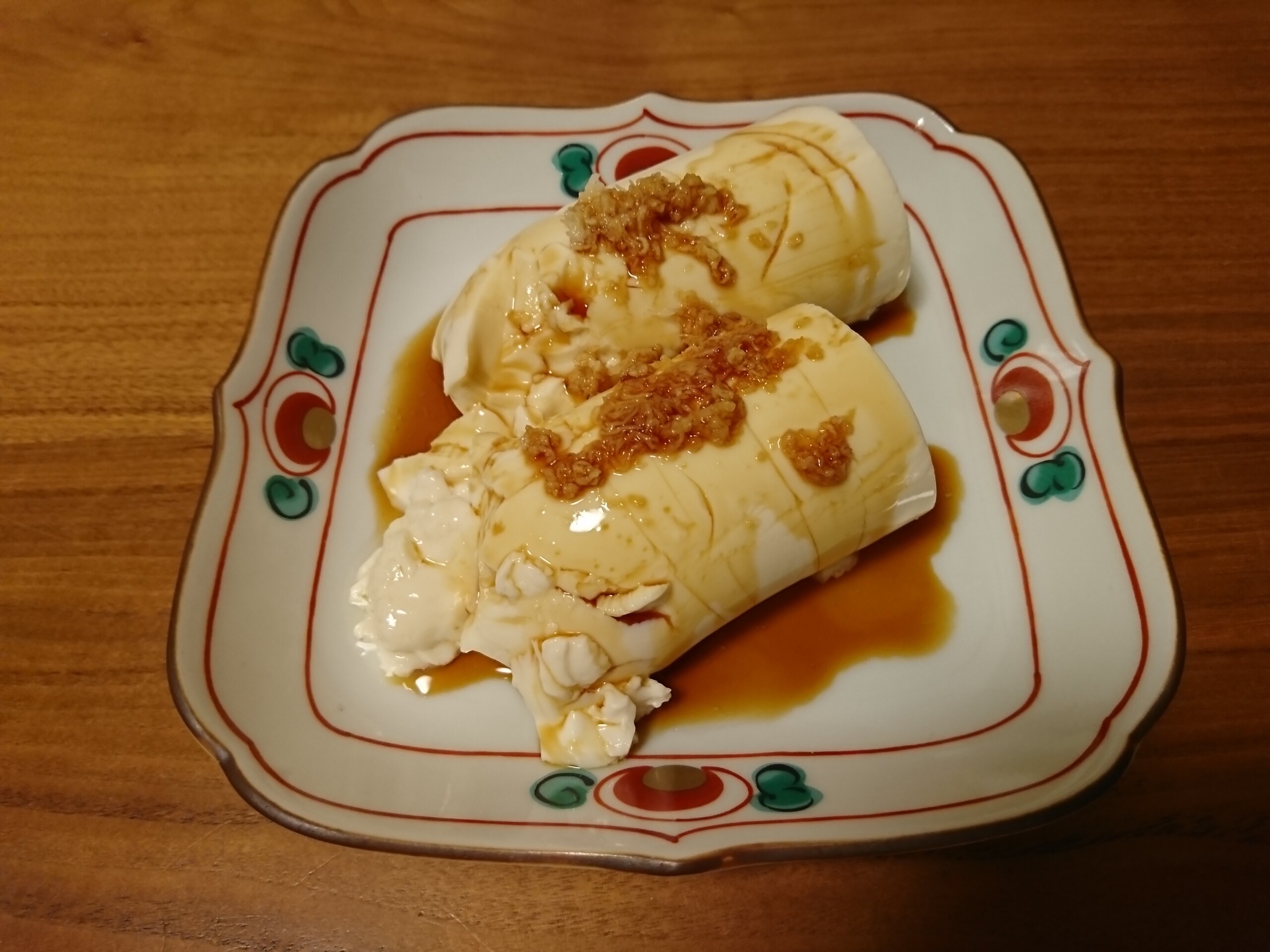袋ごと真っ二つに切って皿に移し生姜醤油で頂きます。食べた感想はサッパリとした滑らかな口当たりで大豆の味がちゃんとあって生姜醤油との相性が良くてメチャ美味しかったです。