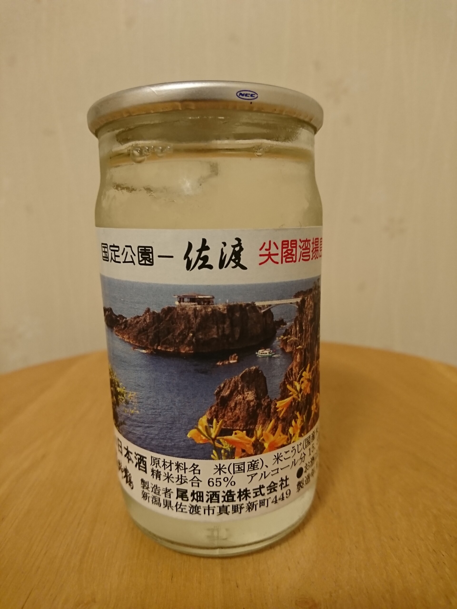 今日は新潟県の佐渡島を旅行した時に、尖閣湾揚島観光売店で280円で購入した酒「真野鶴・揚島ワンカップ」を冷やして飲みました。この酒、中味は佐渡の酒蔵・尾畑酒造の真野鶴の普通酒で、ラベルが尖閣湾揚島游園の風景になっていて観光地向けの商品と思われます。飲んだ感想はやや淡麗の辛口の酒で酒が少し老ねてますが、熟成した旨味もちゃんとあって美味しかったです。