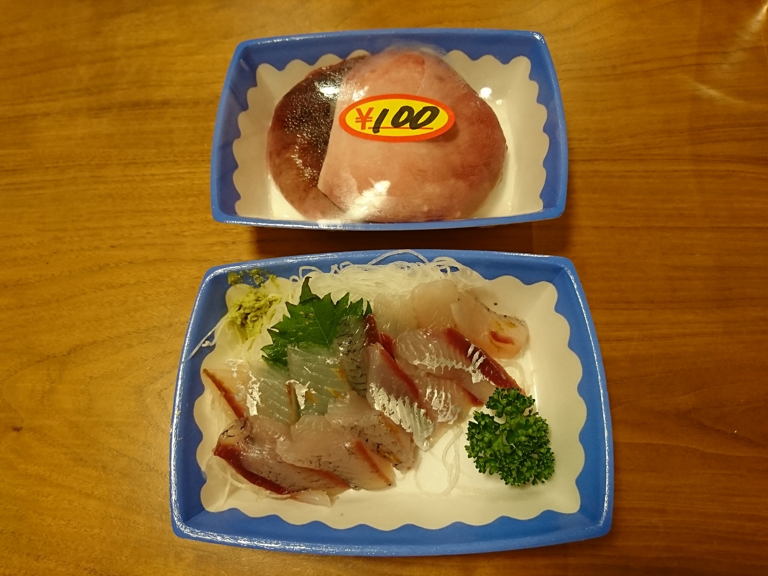 今日はトビウオの刺身(400円)と100円で売られていたタコ頭の刺身を買いました。