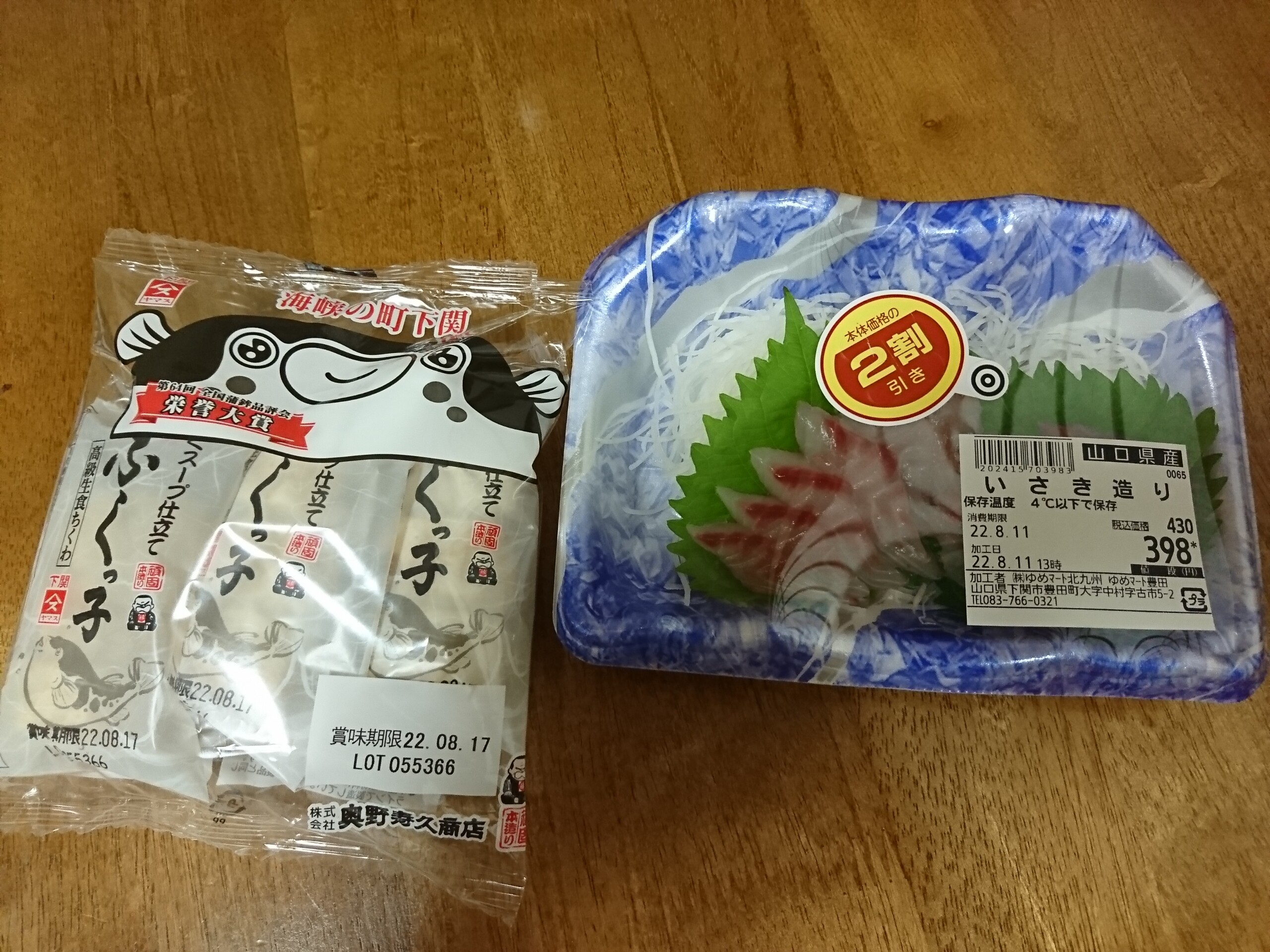 今日の酒の肴はライダーハウス近くのスーパーで買った、山口県産のイサキの造りと下関のふぐスープ仕立てのちくわです。地物のイサキの刺身!安くて美味い!さすが地物、酒との相性抜群です。ふぐの旨味が染み込んだ生ちくわも美味し〜い!