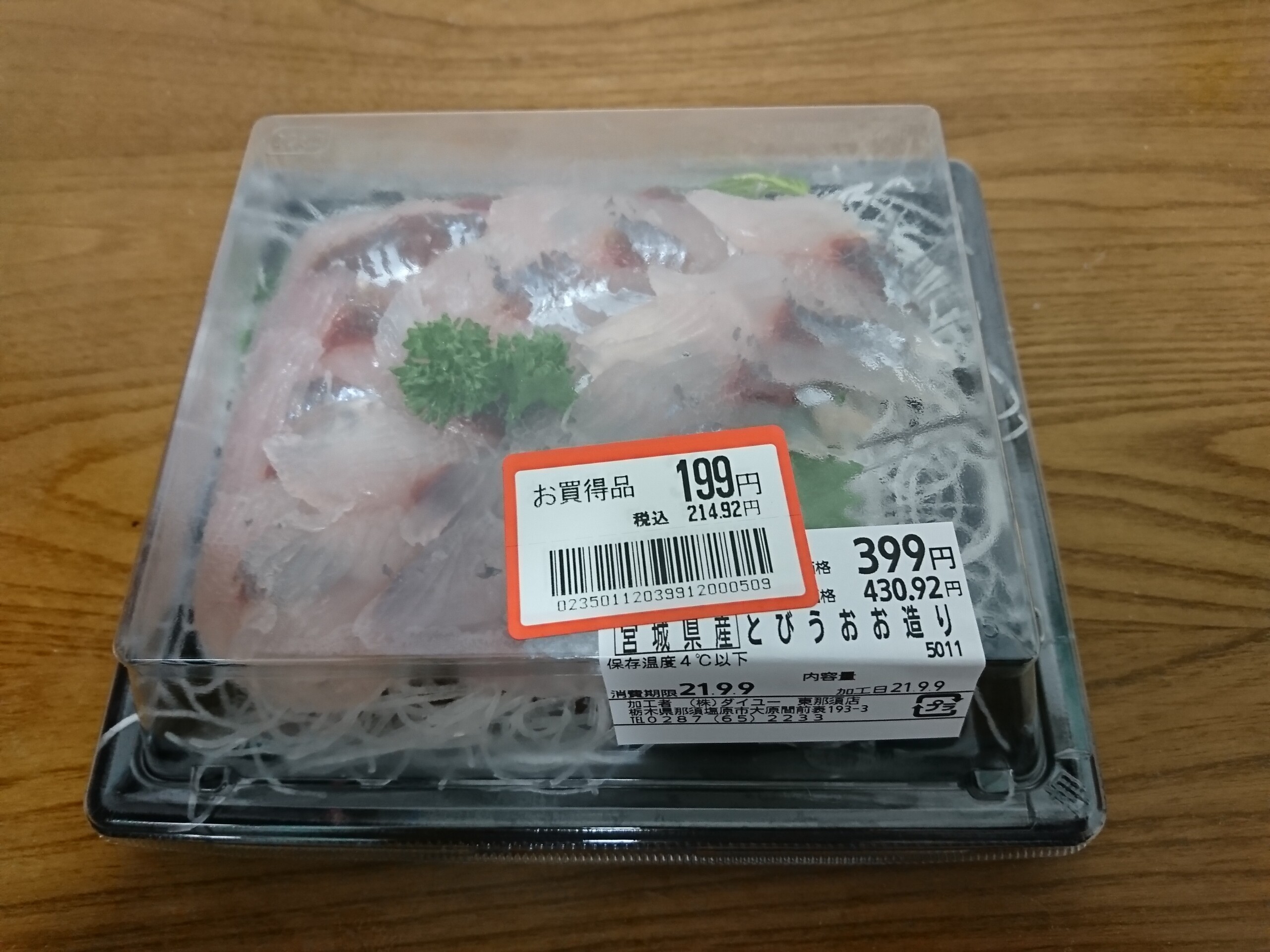 今日の酒の肴は近所のスーパーで半額で買った、宮城県産のトビウオの刺身です。