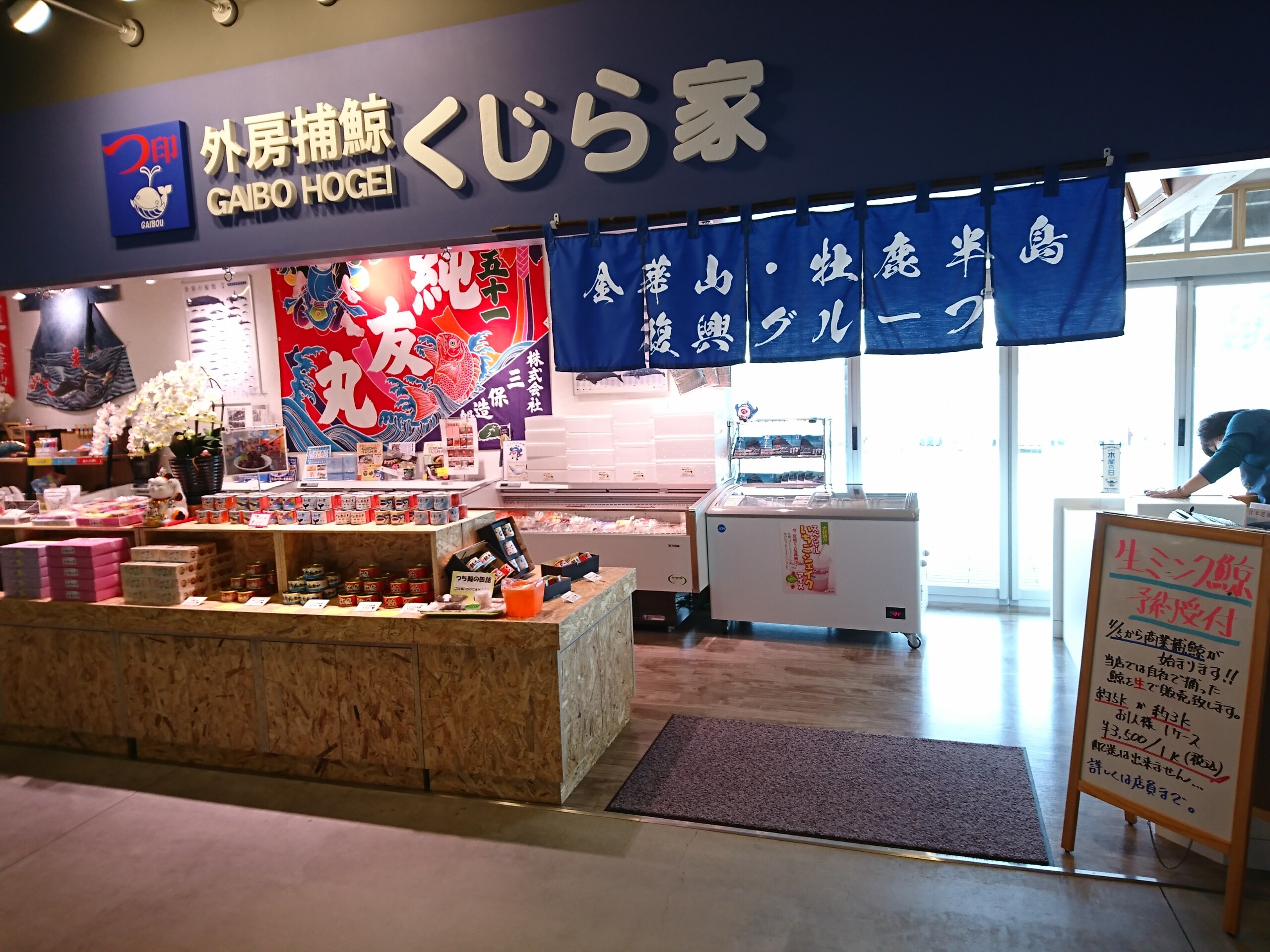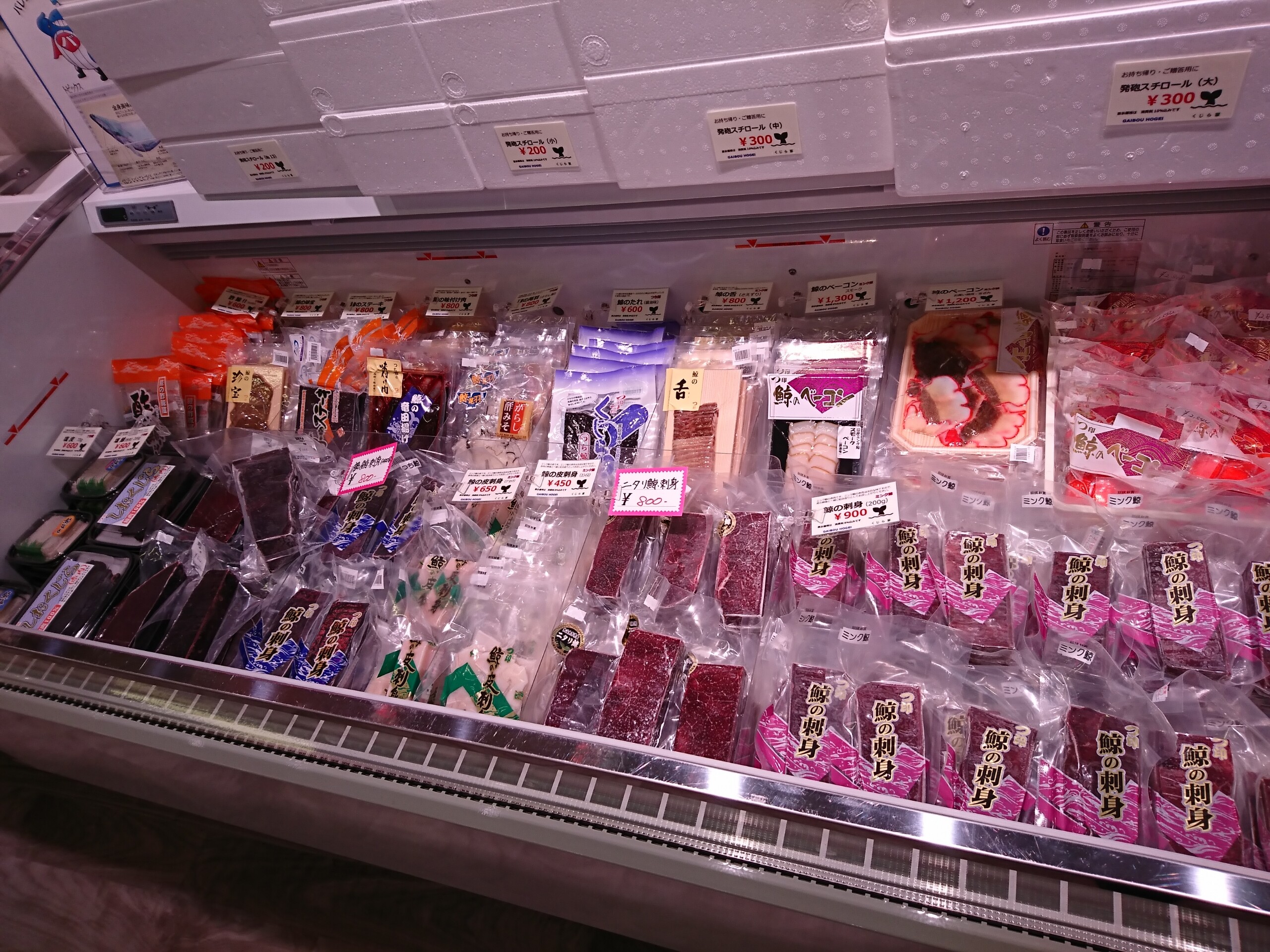 店内では鯨の缶詰や冷凍の鯨肉各種、鯨のいろんな部位が売られていました。晩酌用のアテに鯨の刺身を買いました。