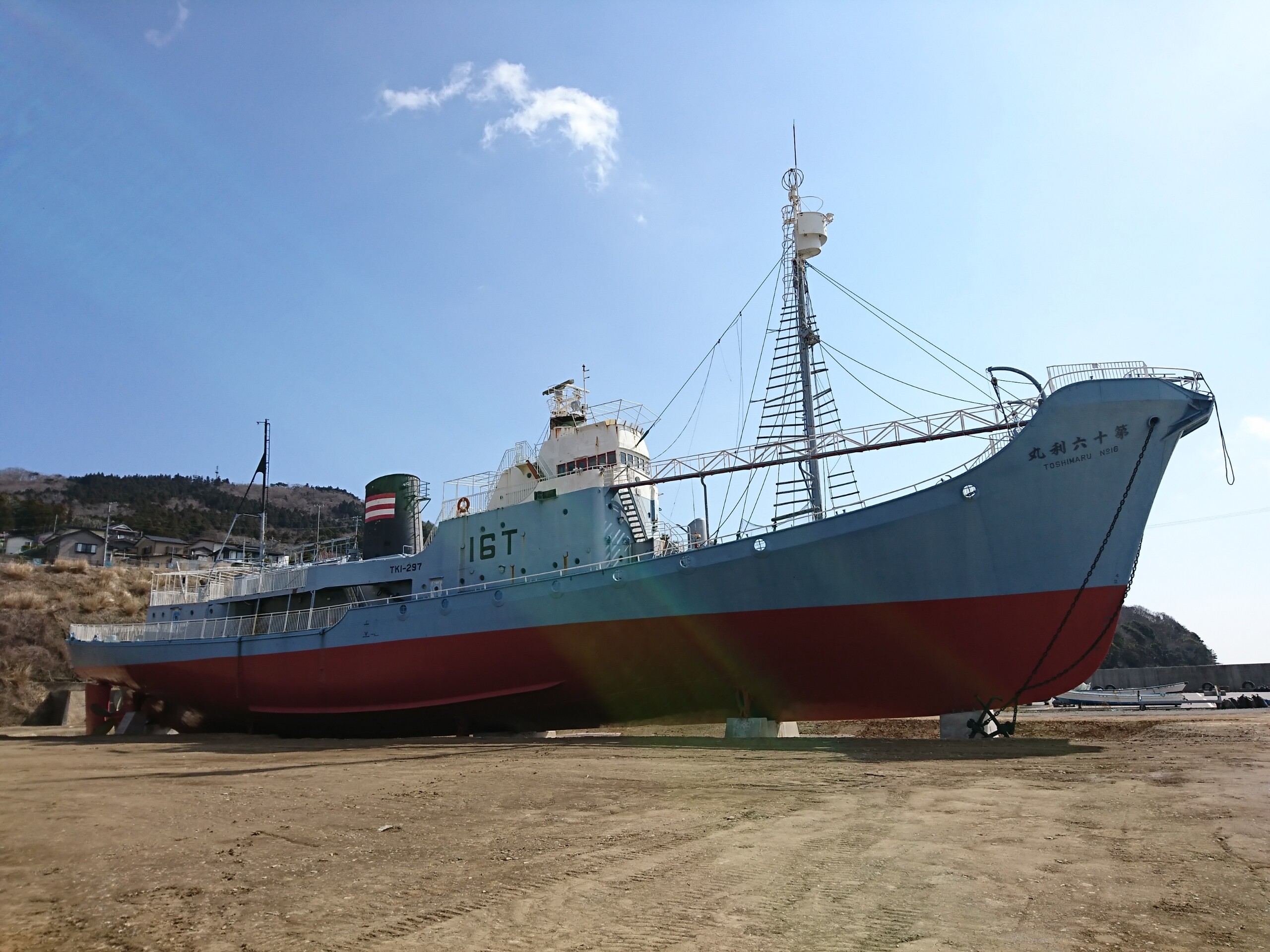 鮎川港の前には大きな捕鯨の町らしく、捕鯨船「第十六利丸」が展示されています。津波で流れ着いたのではありません。