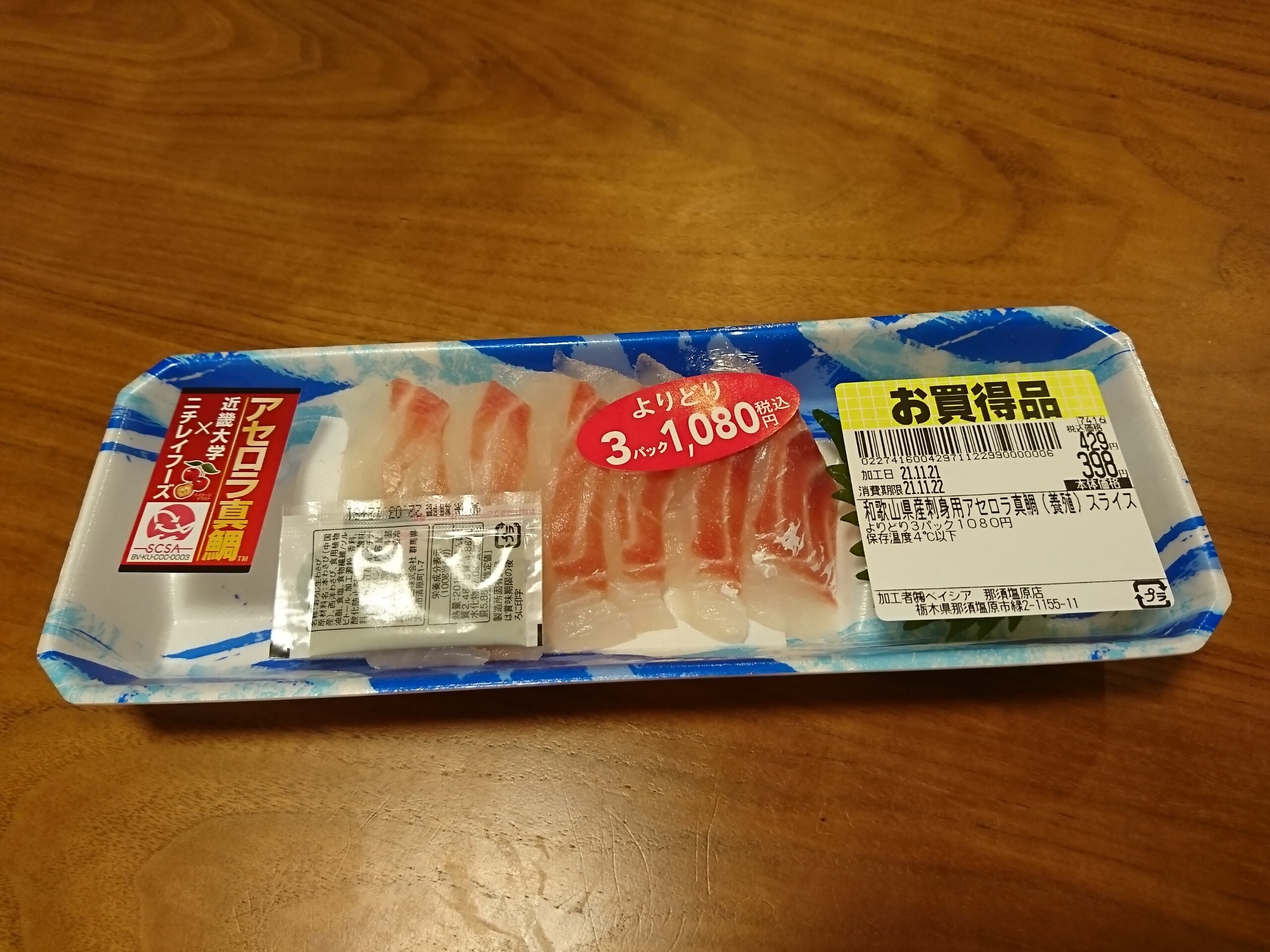 今日の酒の肴はベイシア那須塩原店で買った、和歌山県産のアセロラ真鯛の刺身です。このアセロラ真鯛TMは近畿大学とアセロラ製品でお馴染みのニチレイが共同開発した真鯛で、アセロラの成分を含む特殊な餌で育てられているそうで、現在ベイシアで試験販売中で限定販売されています。