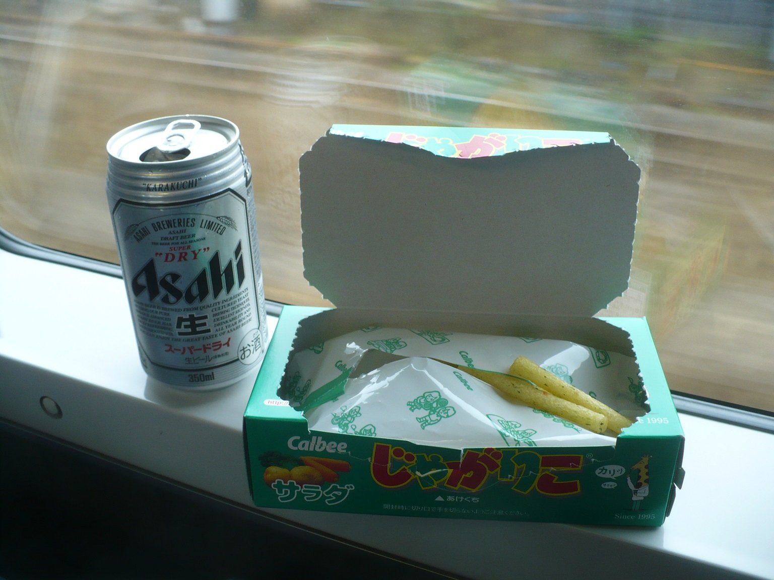 途中で車内販売が来たので、ビールとじゃがりこを買って一杯やりました(^∀^) 日本酒を飲みたかったのですが車内では扱っていませんでした。残念・・・