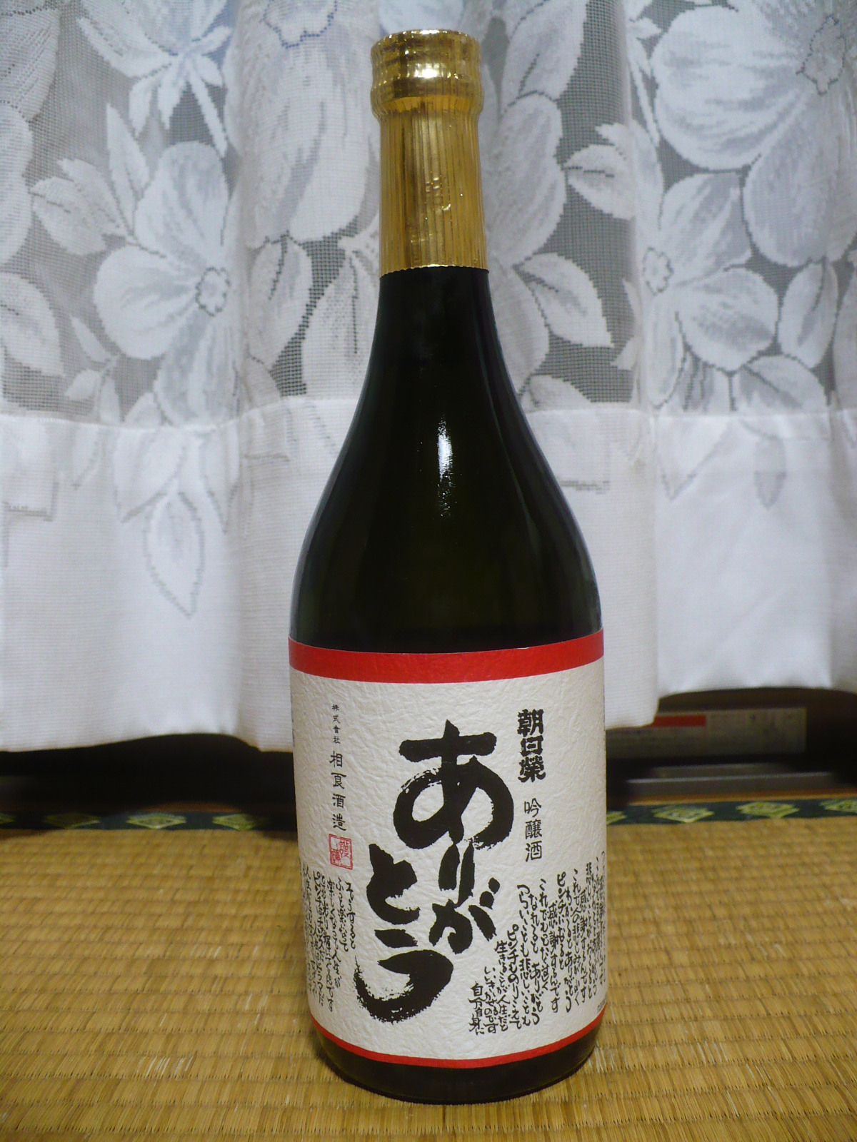 「今日の晩酌!VOL.1111」今日は那須町にある酒屋さん月井商店で1620円で購入した、栃木市の蔵元・相良酒造の醸す酒「朝日榮・吟醸酒・ありがとう」を冷酒で飲みました。この酒、吟醸酒だが精米歩合50%まで高精白した酒造好適米の五百万石を100%使用しています。値段は吟醸酒並みですが、規格は大吟醸酒並で、こだわりを感じます。飲んだ感想はやや淡麗のフルーティーな吟醸香の香る辛口の酒ですが、後味は辛さがスッと消えてほのかに甘くなり、旨味もしっかりとあって美味しかったです。高スペックで、この味わい!1620円は安くてお買い得ですね。お勧めですね!