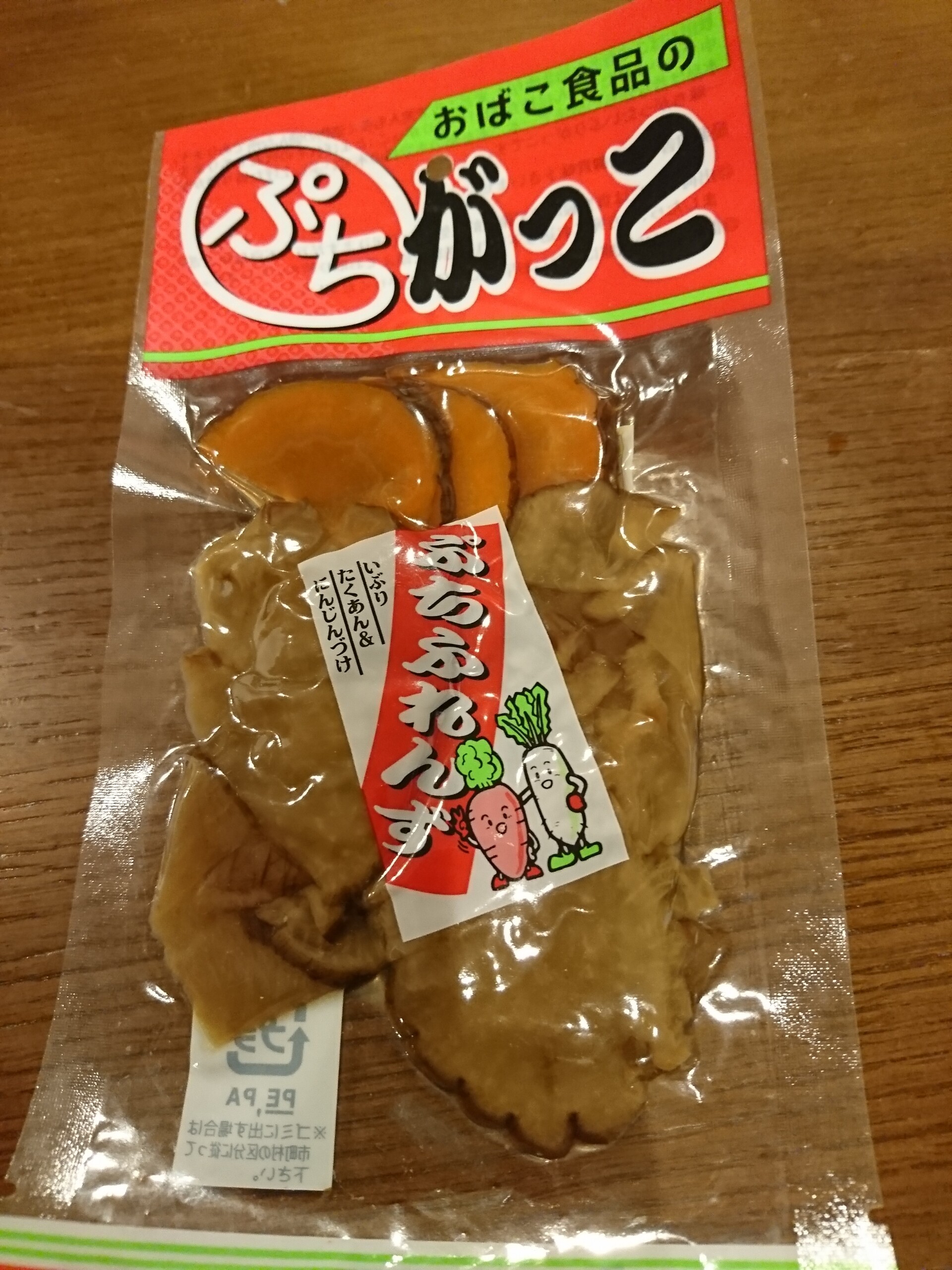 酒の肴は、酒と同じく湯沢市の道の駅で120円で購入した、いぶりがっこです。大仙市のおばこ食品と言う会社が製造しています。