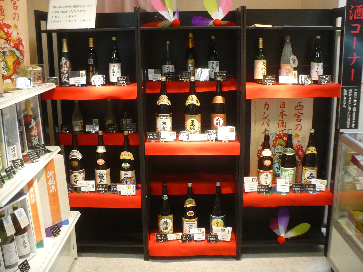 ここでは西宮市内にある西宮郷と今津郷の全ての酒蔵の酒、金鷹・島美人・日本盛・白鹿・白鷹・灘自慢・喜一・灘一・寶娘・徳若・大関・扇正宗の全12銘柄を取り揃えて、だいたい1蔵あたり1〜2種類の酒を販売しています。