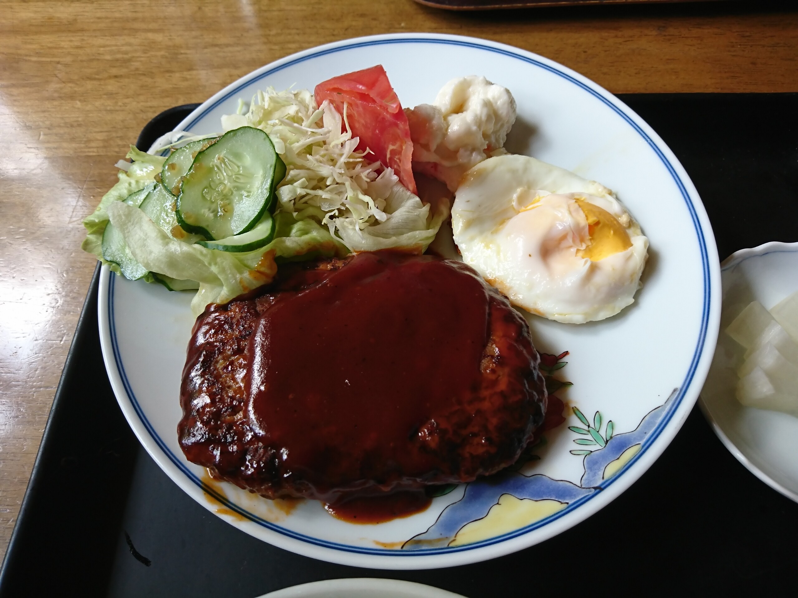 そして私は注文したのはハンバーグ定食(1000円)です。手作り感あふれる家庭的な感じありました。ハンバーグに目玉焼きに生野菜とポテサラ・ご飯に味噌汁と漬物 イイ感じですねぇ〜