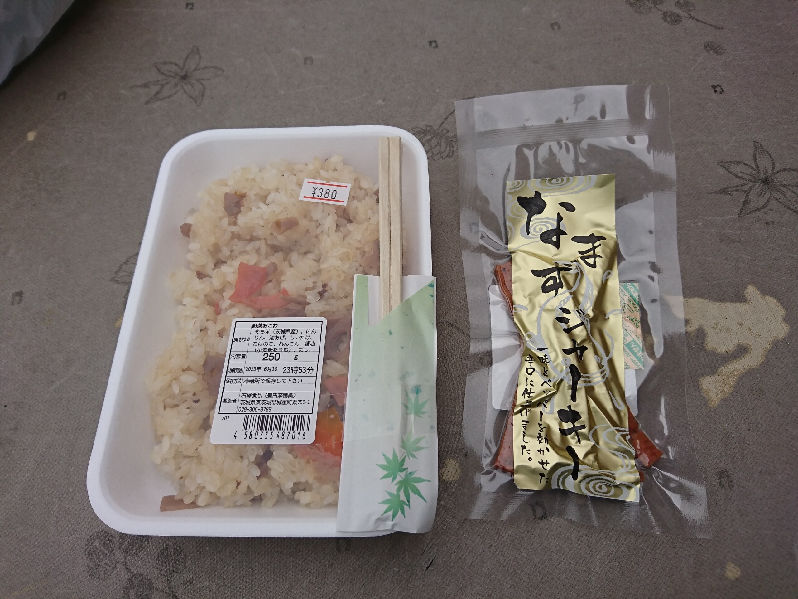 食事ができないので仕方なく、土産物コーナーでおこわとなまずジャーキーを買ってドライブインの敷地内にあるベンチで食べました。まぁ値段もお手頃で結構美味しかったです。