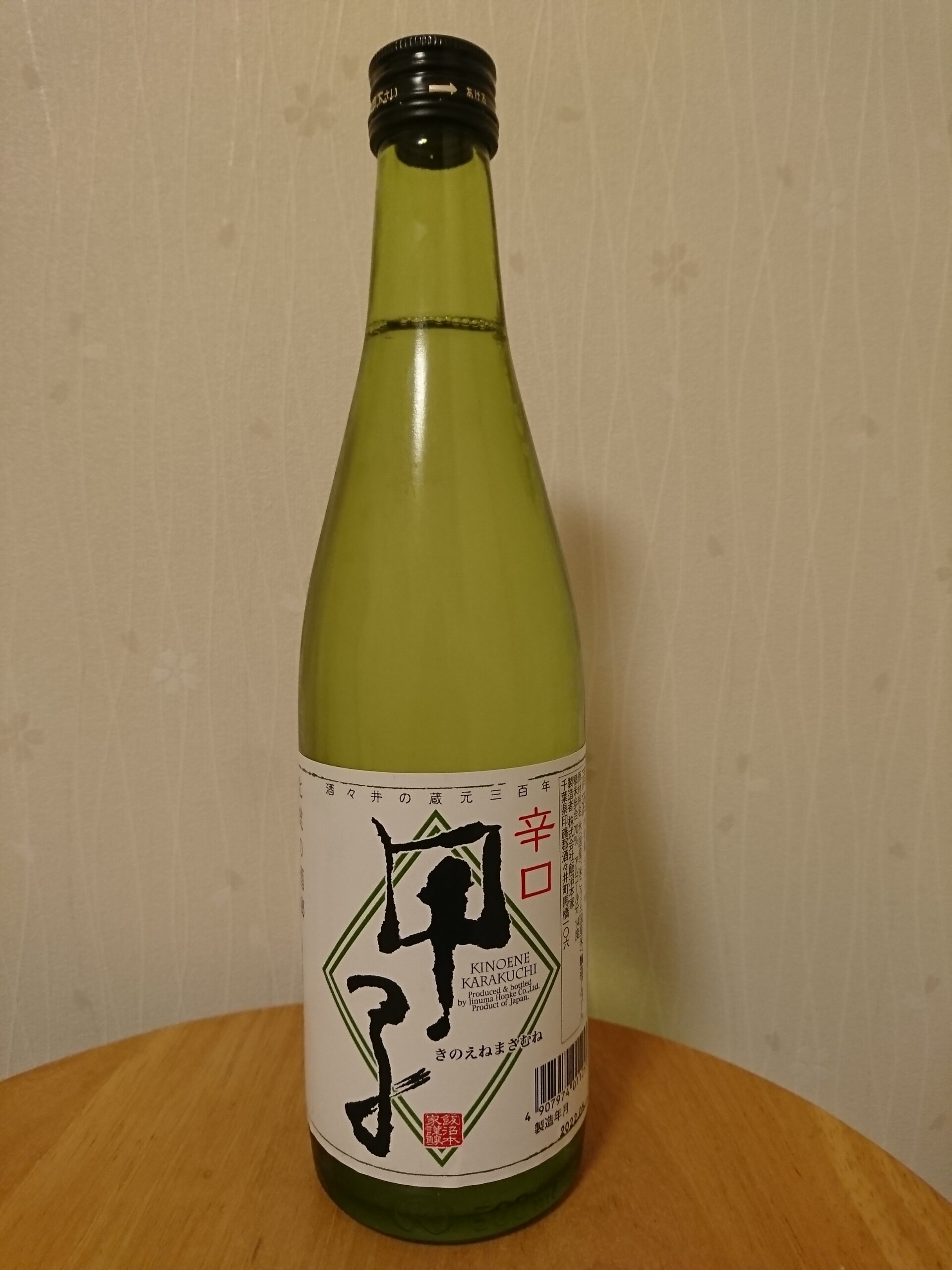 今日は千葉県酒々井町のトライアル酒々井店で499円で購入した、同町の酒蔵・飯沼本家の酒「甲子正宗・辛口」を少し冷やして飲みました。酒は精米歩合70%の米で仕込まれていますが、特定名称酒の表示が無いので糖類無添加の普通酒と思われます。アルコール分は14度台とやや低めです。飲んだ感想は淡麗のちょっと薄っぺらい感じのするやや辛口の酒で、飲み口が非常に良くゴクゴク飲めて後味は薄っぺらいながらも熟成した旨味があってとても美味しい普通酒でした。美味しいので20分ほどで500㎖全部飲んでしまいました。