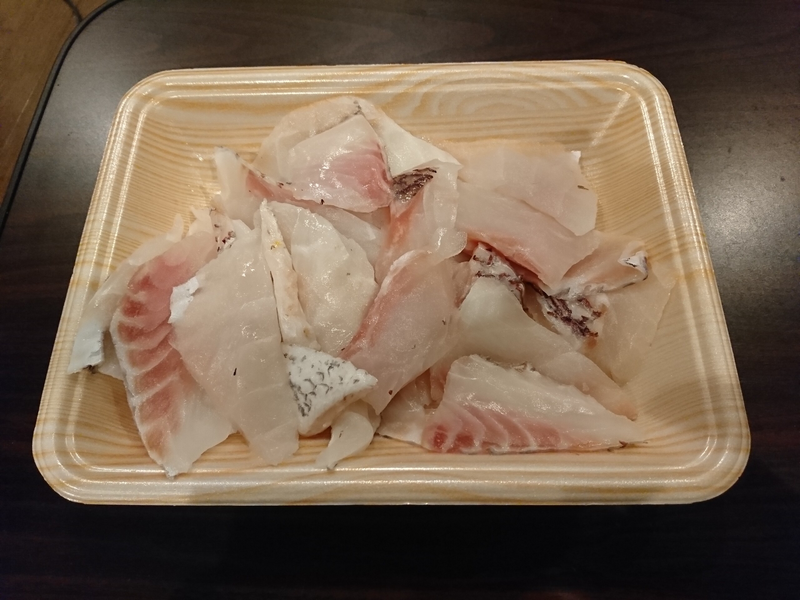 今日の酒の肴は地元のドンキで買った愛媛県産の養殖真鯛の刺身なの・・・?洗い・・・?です。