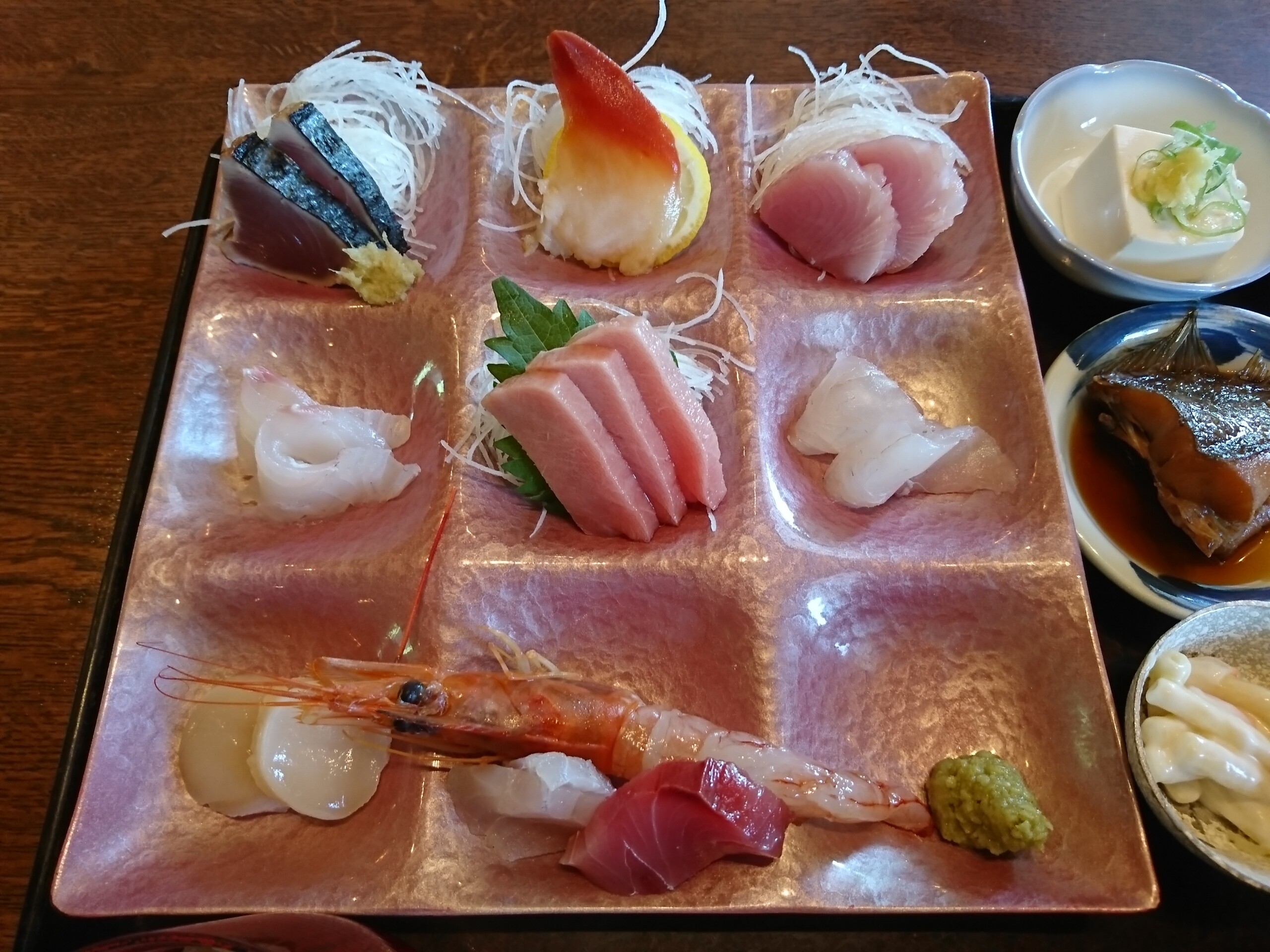 食べたのは刺身定食(1700円)です。刺身定食は刺身盛合せに魚の煮付け・冷奴・マカロニサラダ・ご飯・味噌汁・漬物と見るからにボリュームがありました。