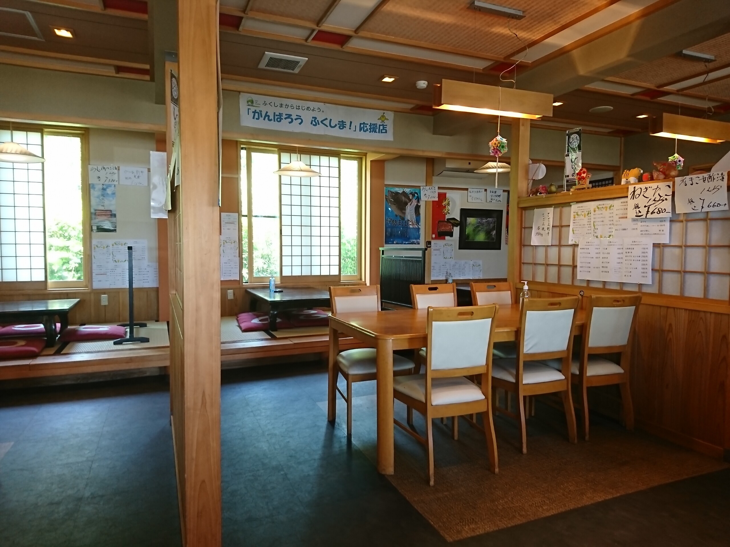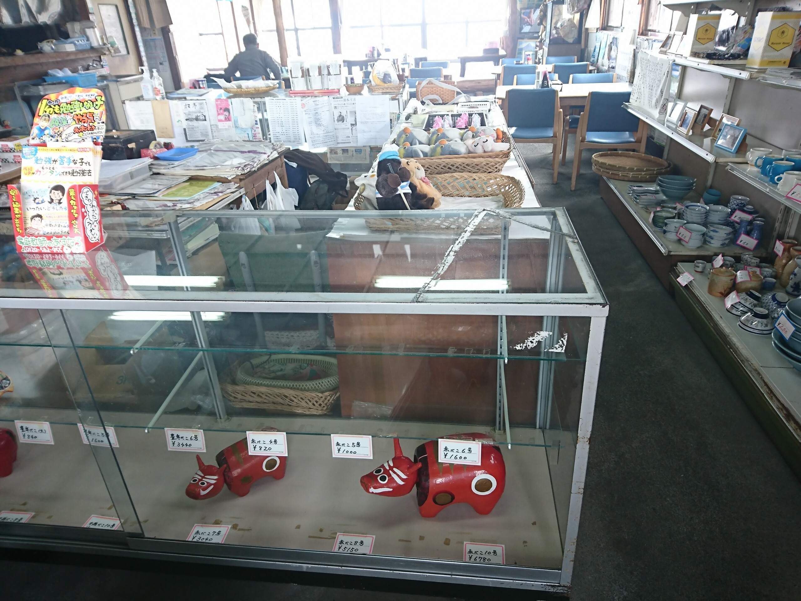 店の中に入ると昭和の匂いにのする寂れた土産物コーナーがあります。手作りの会津の郷土玩具・赤べこも売られていました。そして奥が食事コーナーになります。