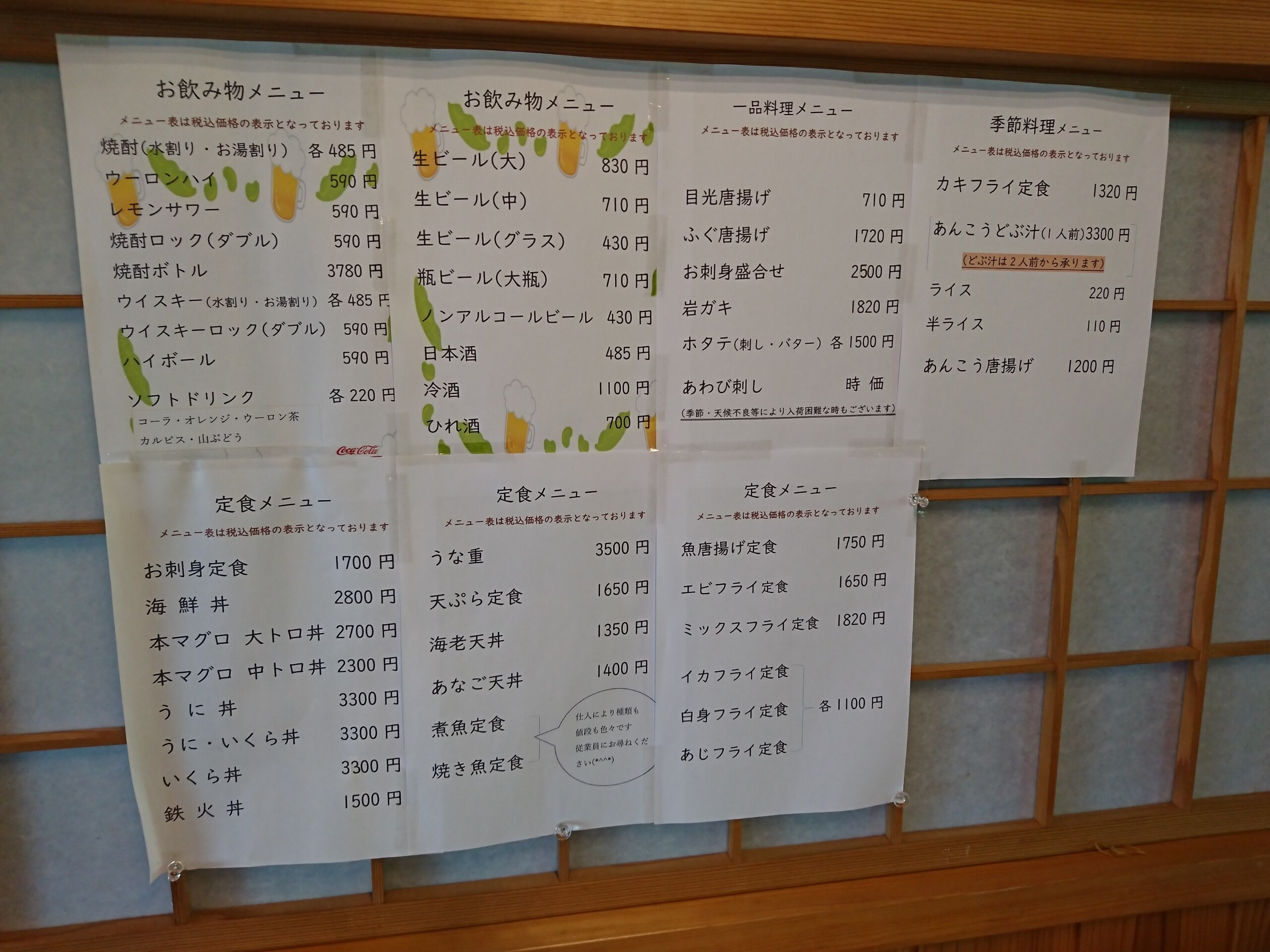 お店のメニューです。地物海産物を使った海鮮料理がうりで海鮮系の定食や丼物・一品料理もあります。