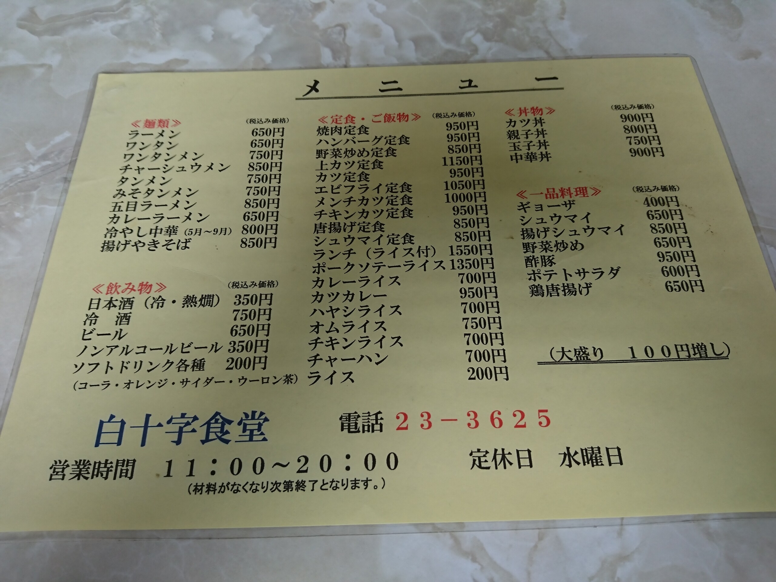 メニューです。 ラーメンや定食・丼物・カレーや焼飯などがありますが種類は少なめです。
