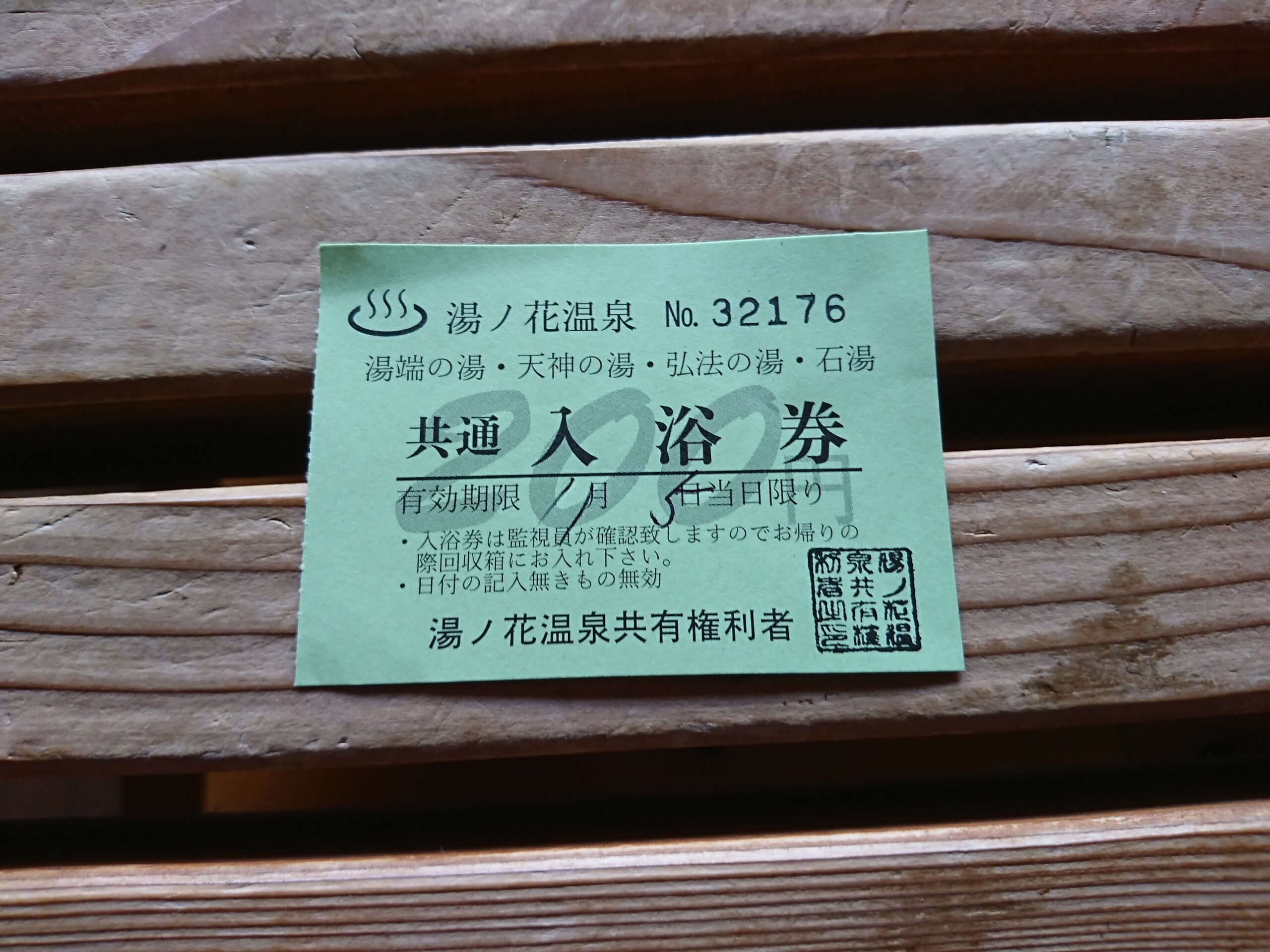 湯ノ花温泉には湯畑の湯・天神の湯・弘法の湯・石湯の4つの共同浴場があり、温泉街の宿屋や商店・民家で200円で売られてる入浴券を買って入浴します。券を買うと一日4か所の温泉が入り放題です。でも券を買わずに入浴していると1000円を徴収されるみたいです。