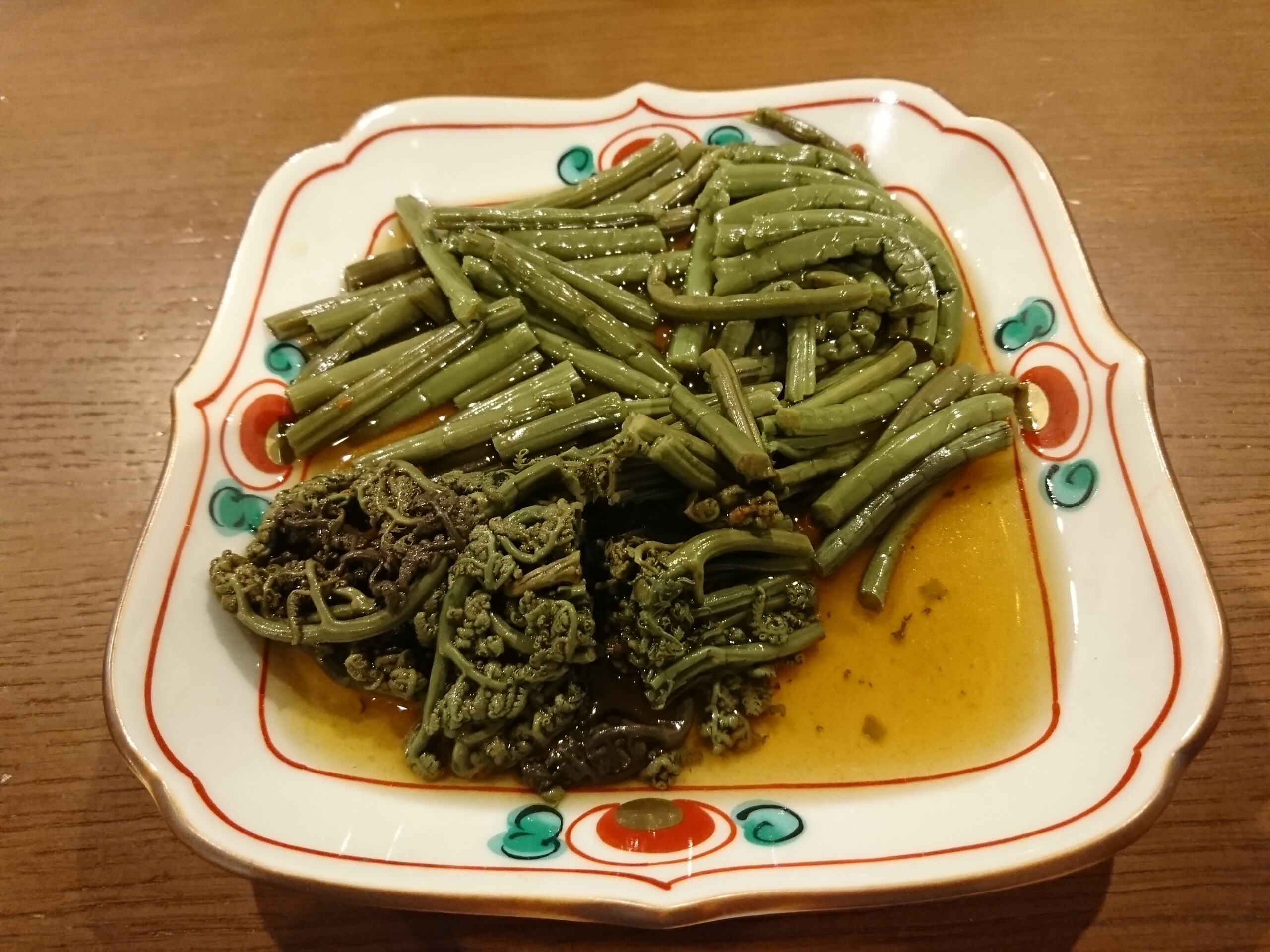 会津ほまれの純米大吟醸と肴はわらびの醤油漬