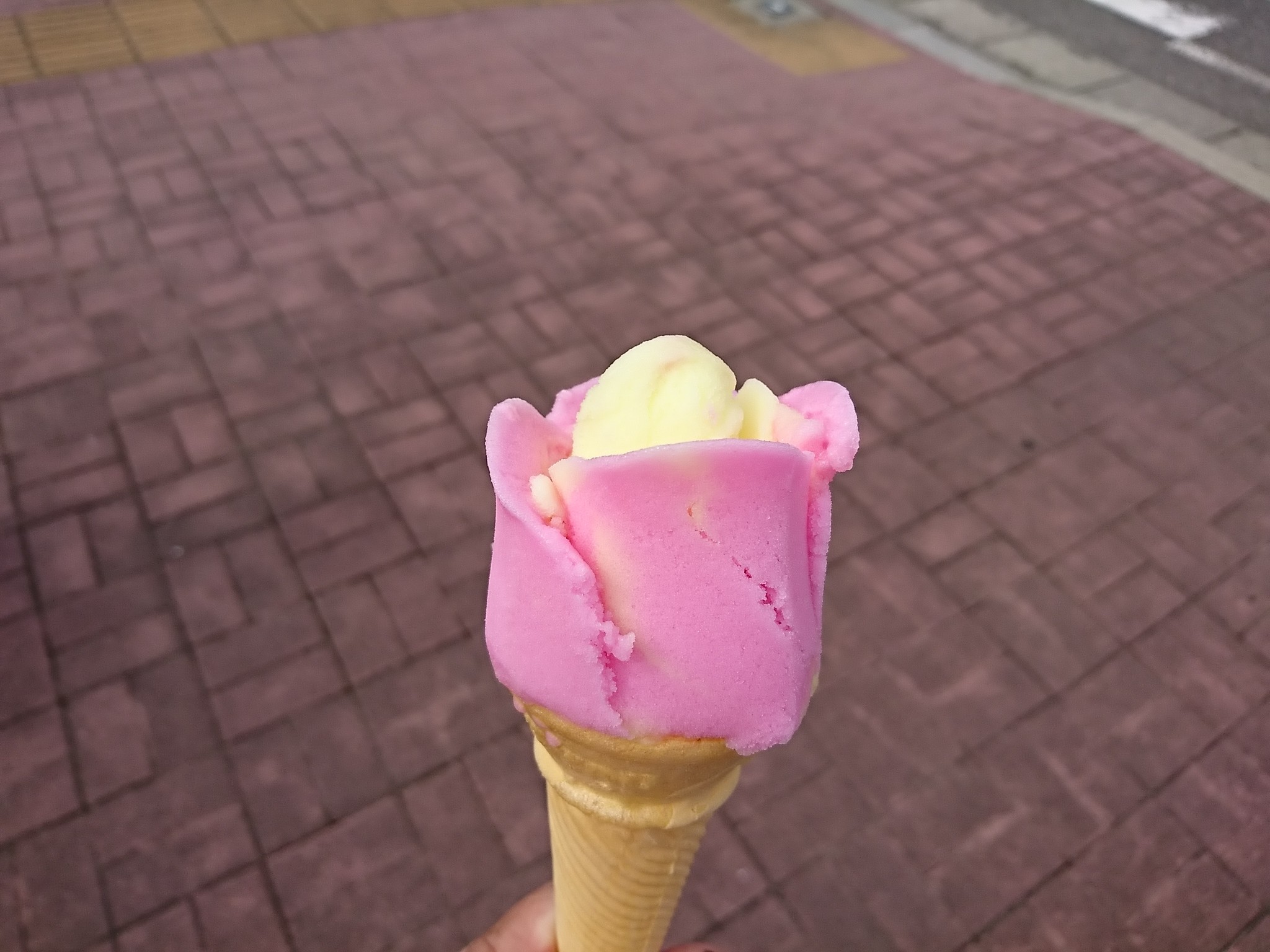 2色のアイスでチューリップみたいな形にして提供されます。1つ200円! 味は甘さがかなり控えめな水っぽい優しい味わいです。昔ながらの味なんでしょう。