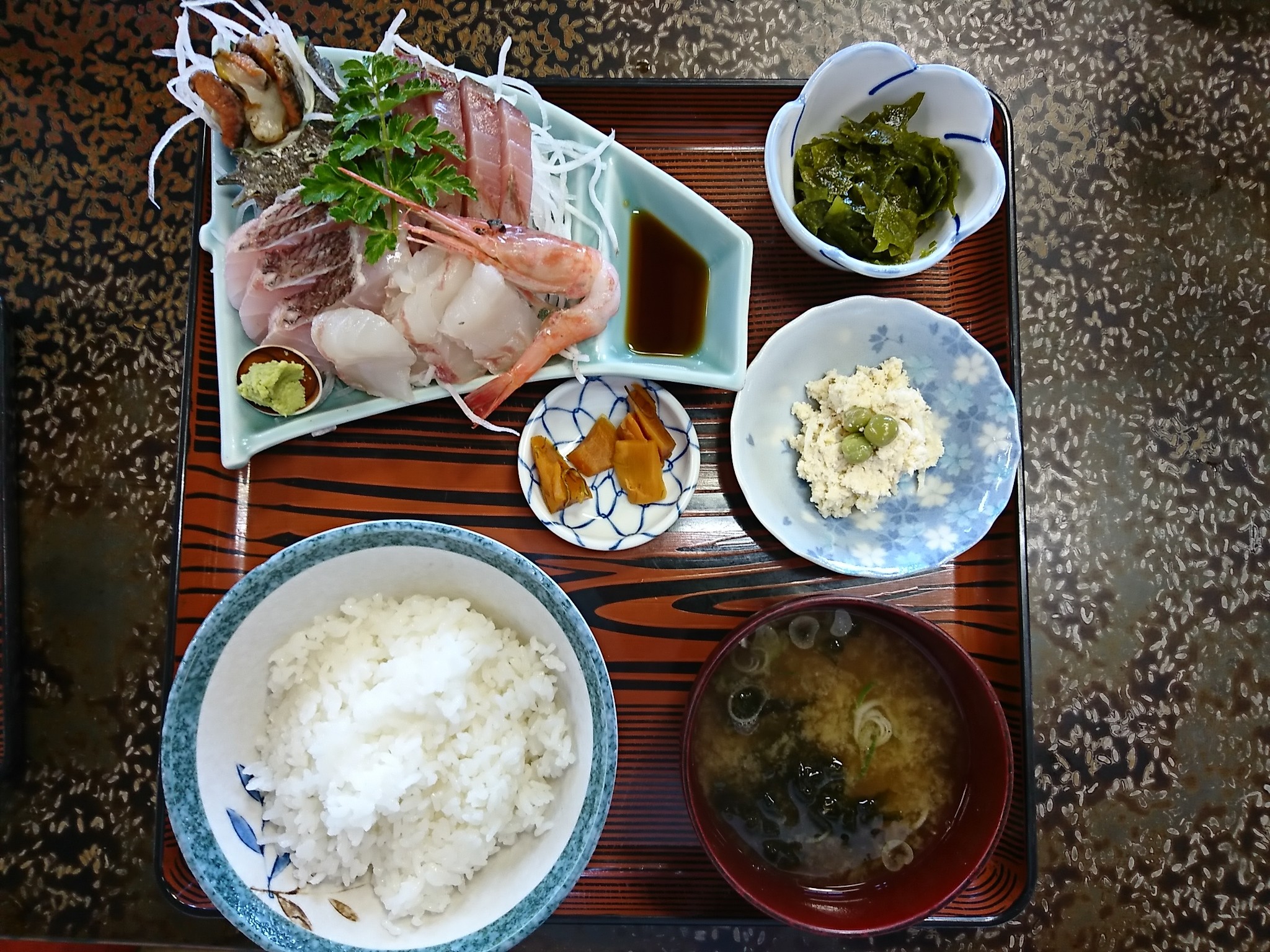 食べたのは刺身定食(1500円)です!サザエと真鯛・ブリと甘エビの刺身と小鉢2品とご飯とみそ汁が付いています。またここの店は漁師さんが営む食堂なので、新鮮でまた値段の割に刺身の量が多い!どれも美味しいが特にサザエと真鯛の刺身は絶品でした。朝から美味しい刺身が食べれて幸せ〜 あぁ〜 日本酒が飲みたい・・・