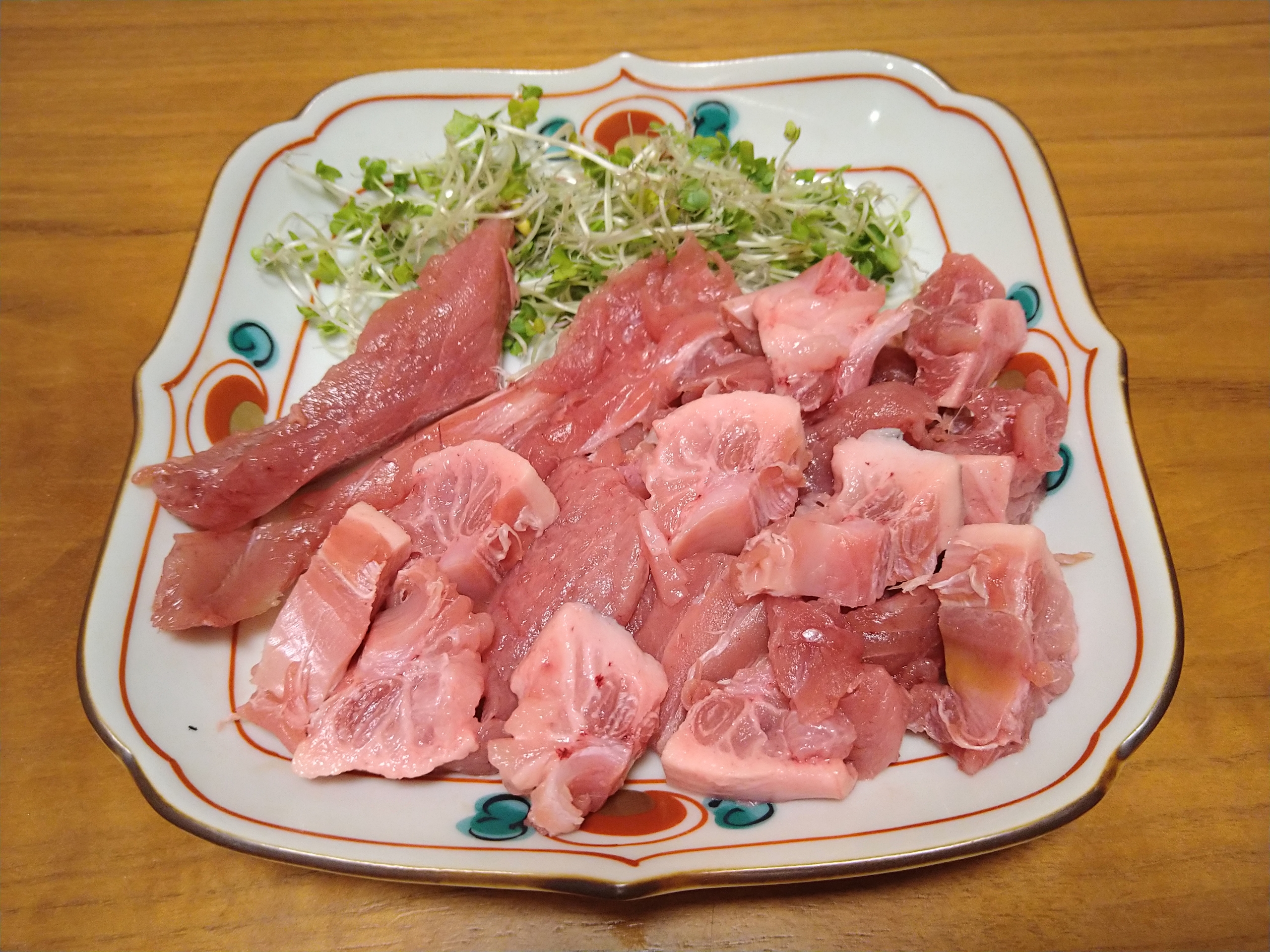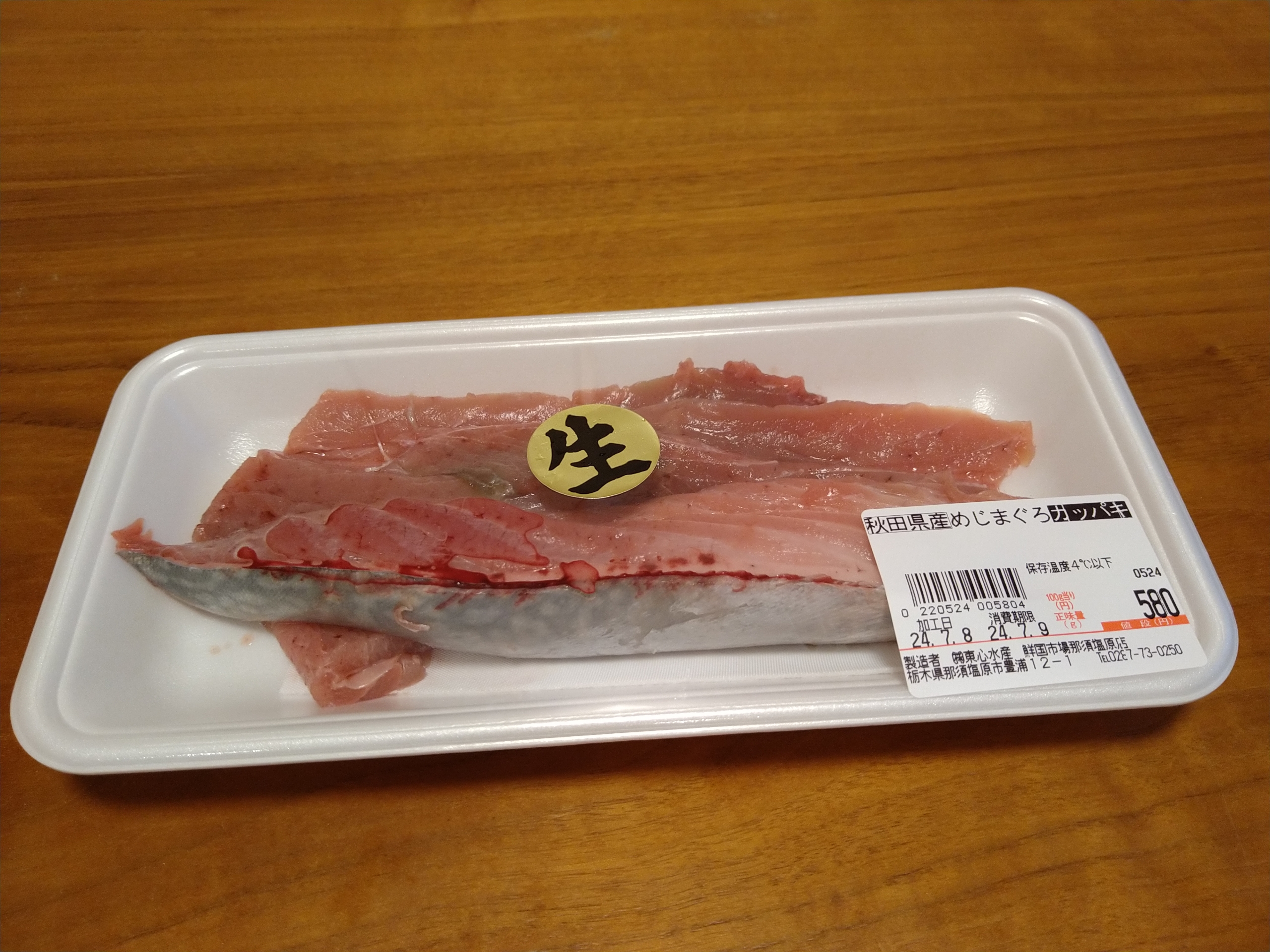 今日の酒の肴は秋田県産の生のメジマグロのかっぱぎです。
