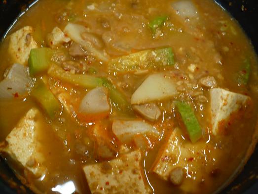 今日は韓国の納豆を使った청국장チョングッジャン(清麹醤)を食べました。チョングッジャンは、納豆をすり潰して米の磨ぎ汁で煮込んだ物だが、具は玉葱・青唐辛子・豆腐・エホバク(ズッキーニ)・ジャガイモ・ニンニクが入っていました。味はややチョングッジャン独特の臭さがあるもののチョングッジャンの何とも言えない旨み(納豆味)があります。例えると濃厚な納豆汁(納豆を入れまくった味噌汁^^)みたいな感じで非常に美味しかったです。そしてこの店料理も美味いが、おかずも充実していてキムチ等の基本的なおかずの他に目玉焼きや太刀魚のフライと言った肉系が出てくるのが嬉しいですねぇ〜 これで価格は4000ウォンだから安いです! 近所にある安くて美味い店なので気に入っています。