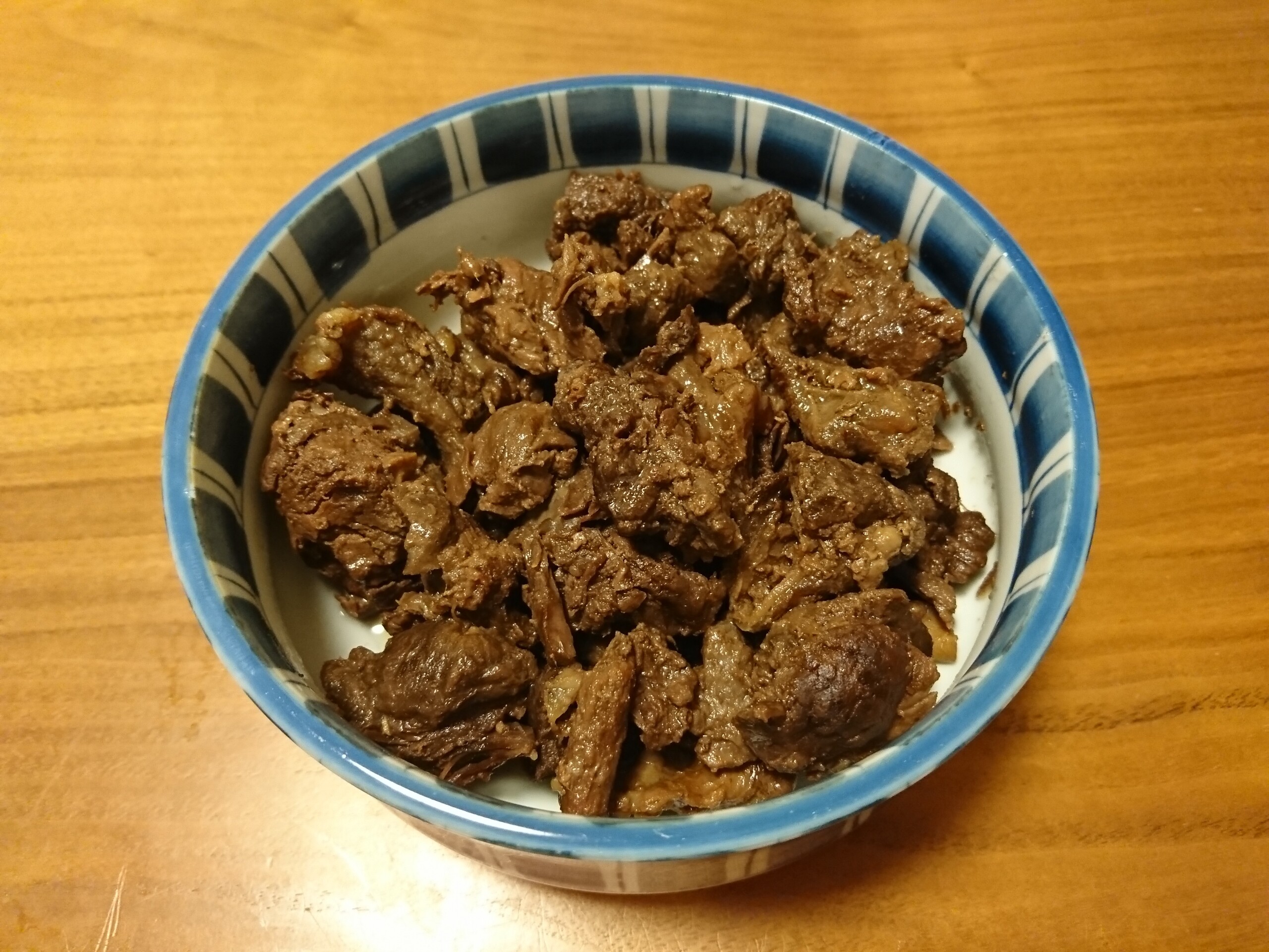 器に移してレンチンで温めて頂きます。食べた感想は肉質が少しパサパサしていますが柔らかいです。甘い醤油味で馬肉の旨味があってメチャ美味しく酒が進みますね。