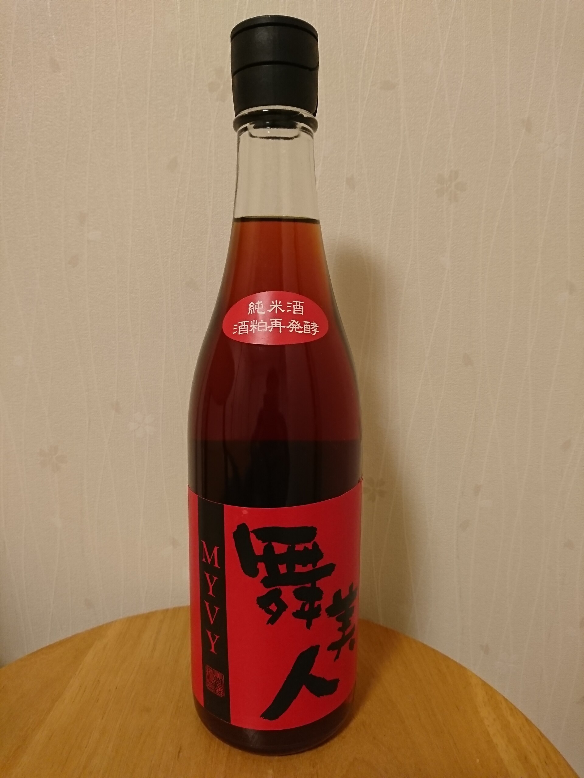今日は東京築地の酒屋さん・酒の勝鬨で1815円で購入した、福井県福井市の酒蔵・美川酒造場の酒「舞美人・純米酒MYVY(まいびー)」を飲みました。この酒、精米歩合60%の純米酒の酒粕を再醗酵させて作った珍しい酒で、色は紹興酒みたいな赤茶色をしています。飲んだ感想は濃醇で甘酸っぱく独特な味わいで、どこか紹興酒にも似ている様な酸味があるが味醂にも似た様な味わいがあります。アルコール度数も17度台と高めであまりゴクゴク飲める酒ではありませんが、酸味と濃い旨味がある甘口の酒で本来の日本酒の味とはかけ離れていますが、これはこれで結構美味しかったです。