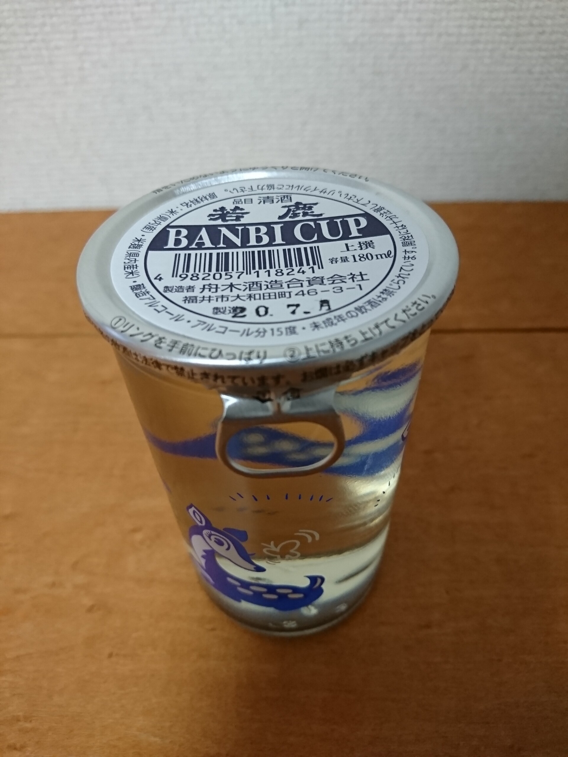 今日は福井県敦賀市内にあるアルプラザ敦賀店で257円で購入した、福井市の舟木酒造のカップ酒「若鹿・上撰バンビカップ」を飲みました。酒は糖類無添加の普通酒で、バンビカップと言えば大阪府の秋鹿のバンビカップが有名ですが、若鹿のバンビカップも結構古くから販売されていて私も14年前に飲んでブログで紹介しています。以前飲んだ時は上撰や金印と言った小印が付いて無かったんですが、今回飲んだバンビカップは上撰の小印が付いていました。飲んだ感想はやや濃醇に感じる甘だれた感じのある酒で少し老ねてて後味はアルコール辛さがありますが旨味もあって美味しかったです。
