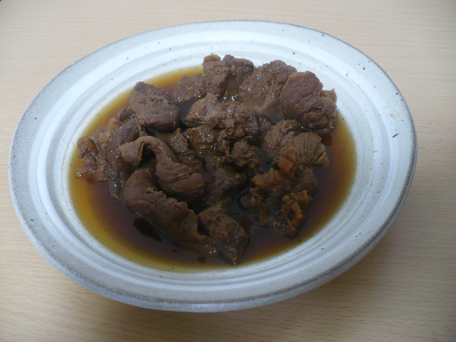 筋が多い部位なので切り出し肉だと思います。じっくり煮込んだので筋は柔らかくて美味しいですが、筋に付いてる肉の部位は煮込み過ぎもあってか?パサパサとして肉が歯に挟まります。でも味は美味しくてご飯のおかずにも良いが酒の肴にも最適です!