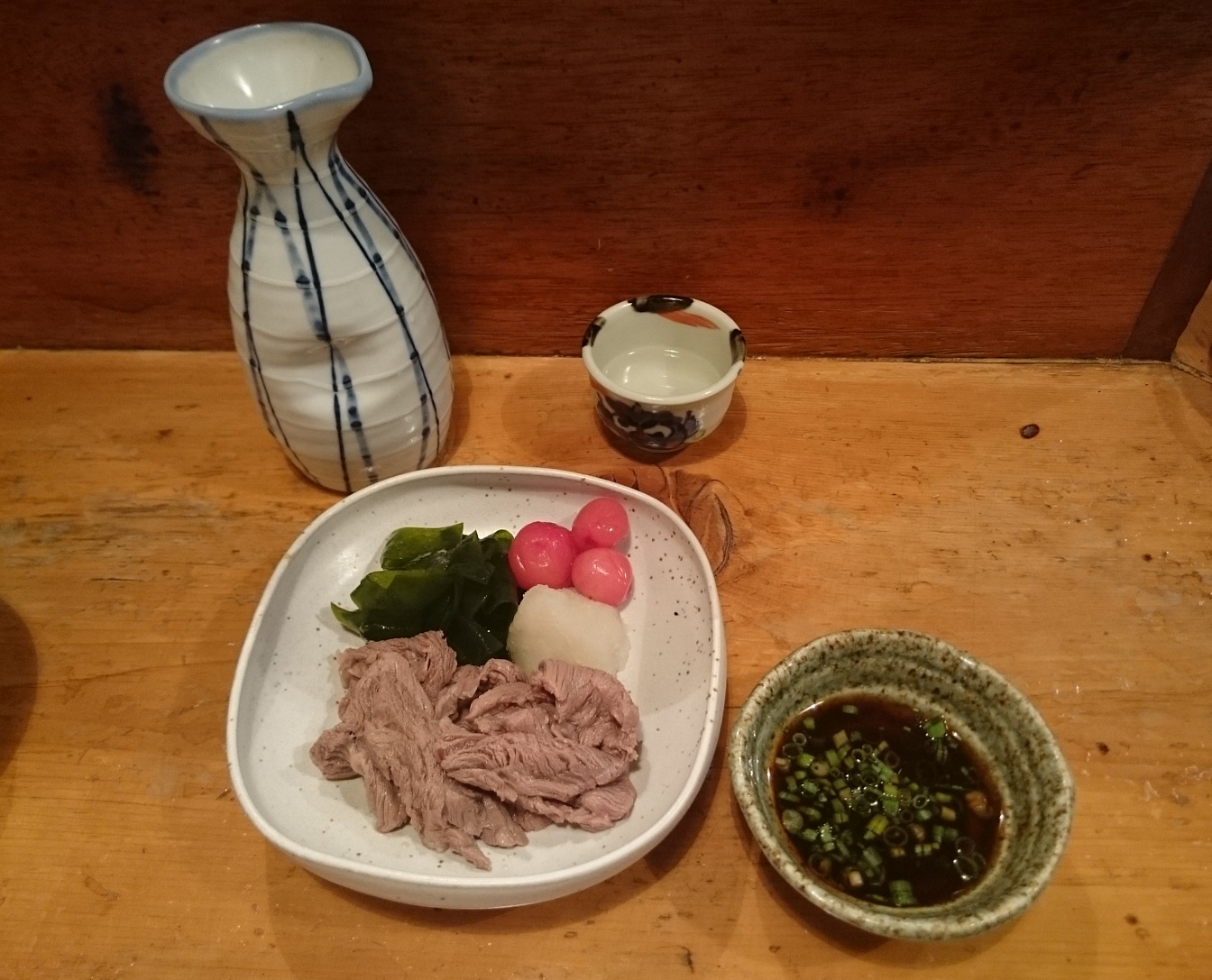 まず突き出しにクラゲの酢の物が出てきました。コリコリとした食感でゴマ油を使って中華風の味付けですが、日本酒にも良く合い美味しかったです。酒は新潟の地酒・萬寿鏡です!