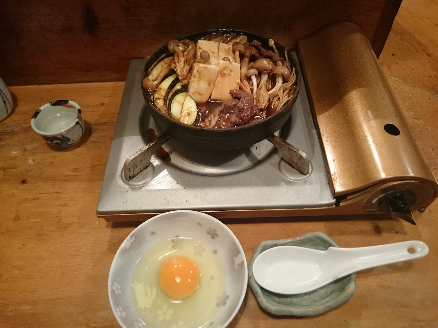 煮込む事、約5分 桜鍋の完成で〜す!桜鍋は馬肉のすき焼みたいな物で、玉子につけて頂きます。甘辛く味付けされていて野菜と馬肉の旨みが出て絶品でした。これは美味い!酒が何杯でも飲めてしまいますねぇ〜