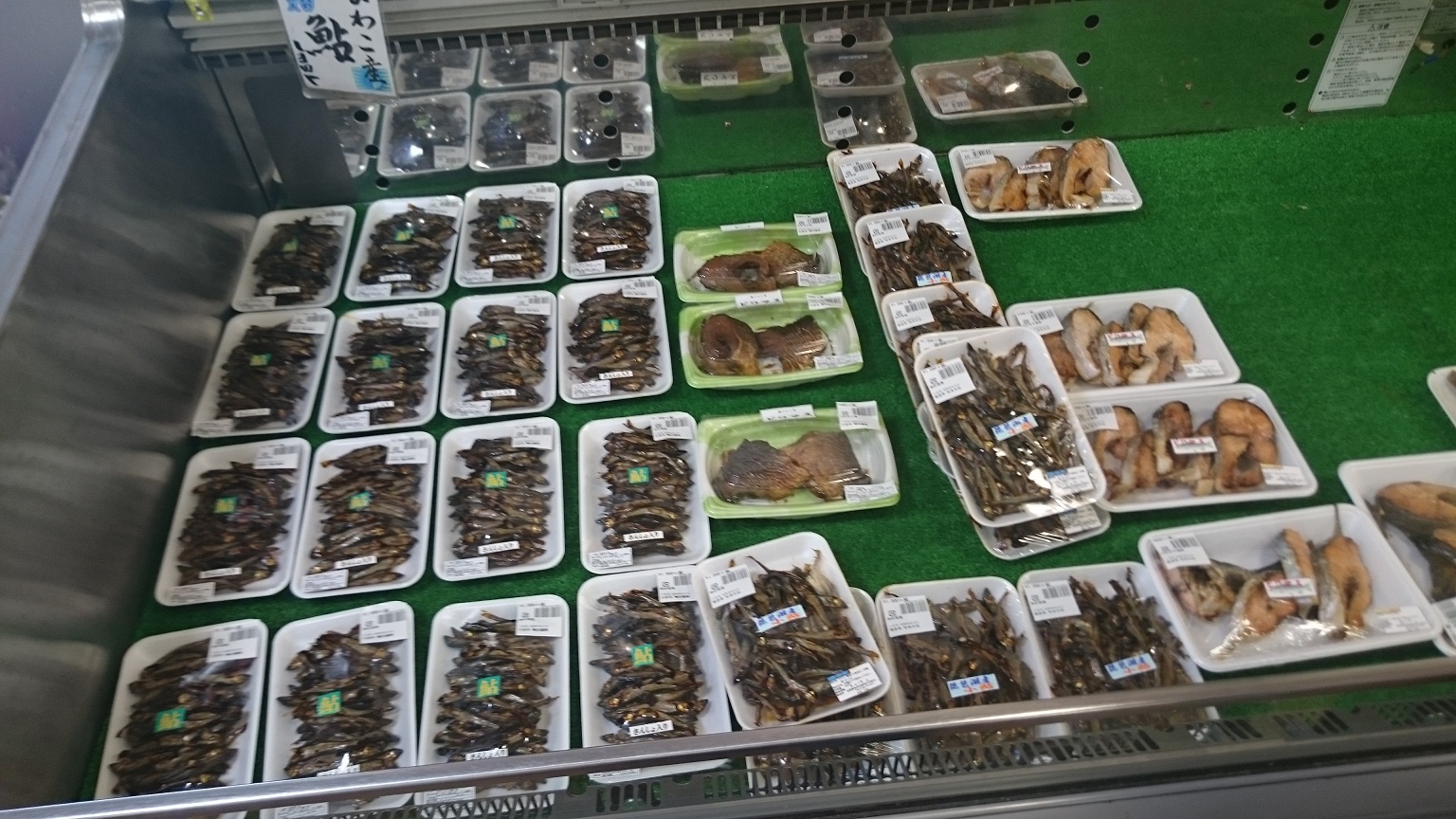 そして何と言っても滋賀の郷土料理である鮒寿司は切身から姿まで高価ですがたくさん売られていました。その他にも琵琶湖で獲れる石貝や手長エビ・タニシなどの佃煮も売られていて湖魚コーナーはかなり充実していました。