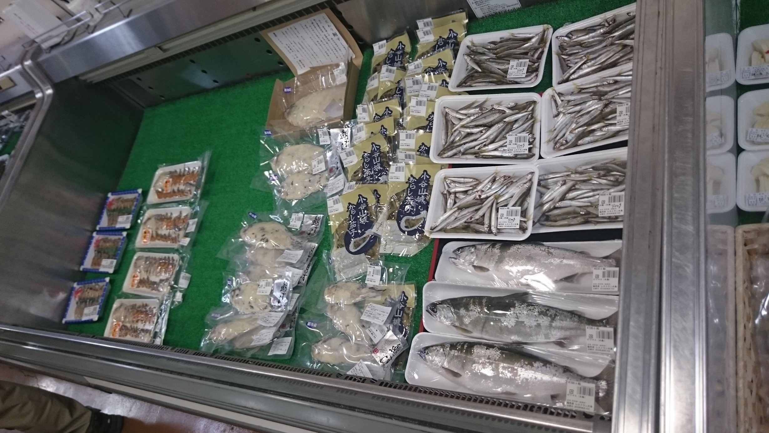 湖魚を扱うコーナーでは、生のビワマスやワカサギなども売られています。