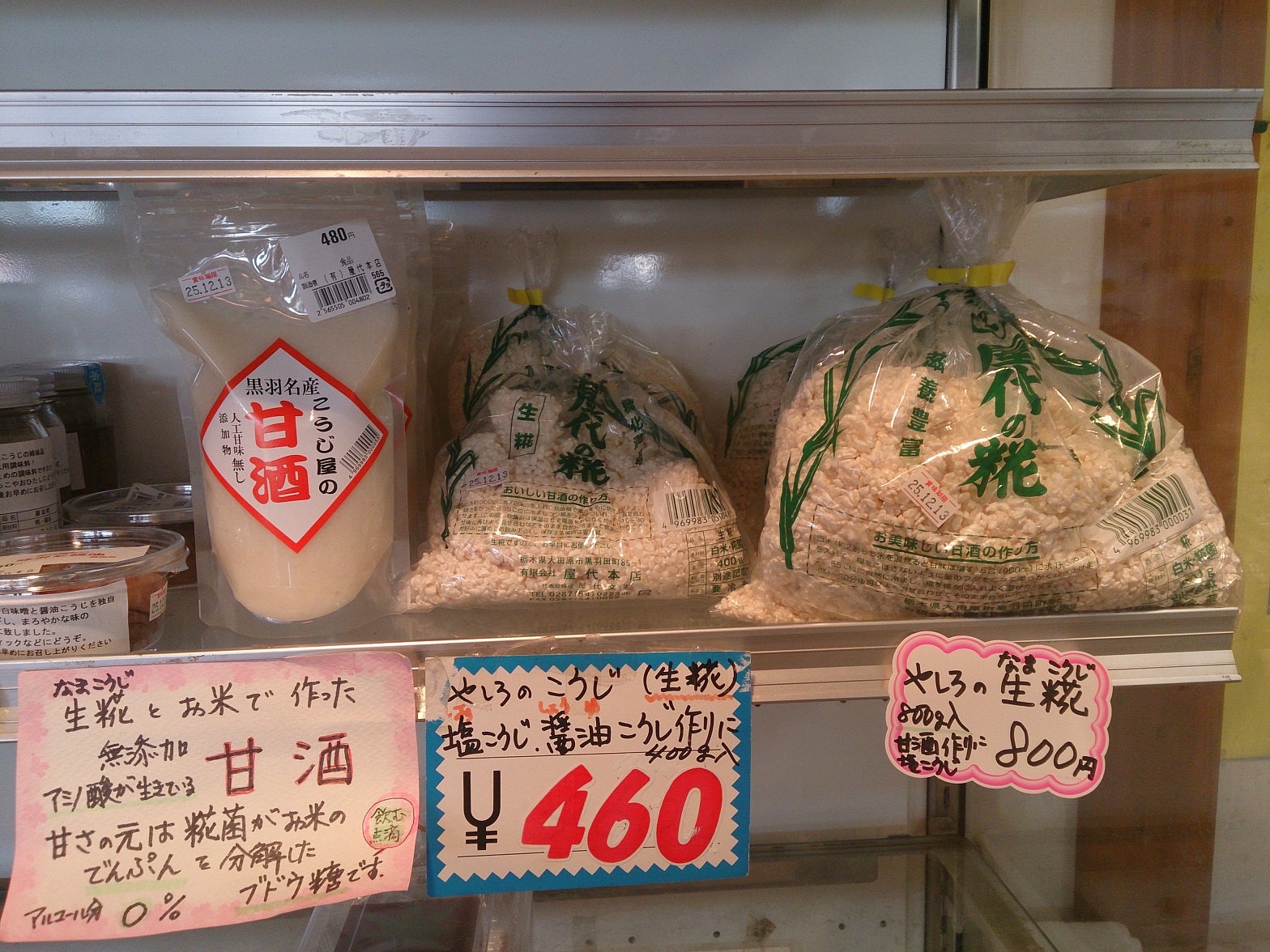 買った米麹は地元・大田原市の味噌屋さん屋代本店の物です。米麹って意外に長持ちするものだと思ってましたが、袋に書かれている賞味期限は12月13日で1ヶ月以上も過ぎていました。少し乾燥してカリカリとしていますが・・・ 冷蔵庫で密閉して保存してたので問題はなさそうです。