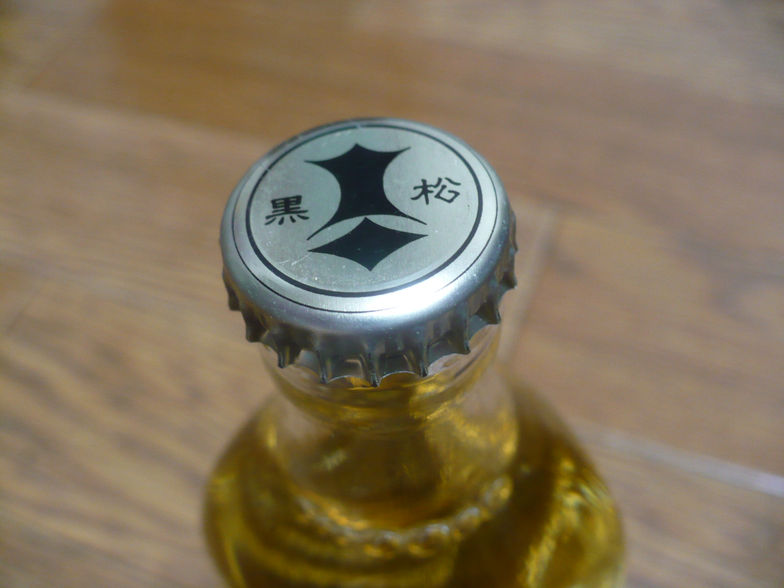 蓋は王冠で一般のお燗壜の王冠よりも一回り小さい小型の王冠を採用しています。小さい王冠だが、ちゃんと黒松剣菱と書かれおり、フィルムを剥がすと剣菱の王冠が輝きを放っていました。^^