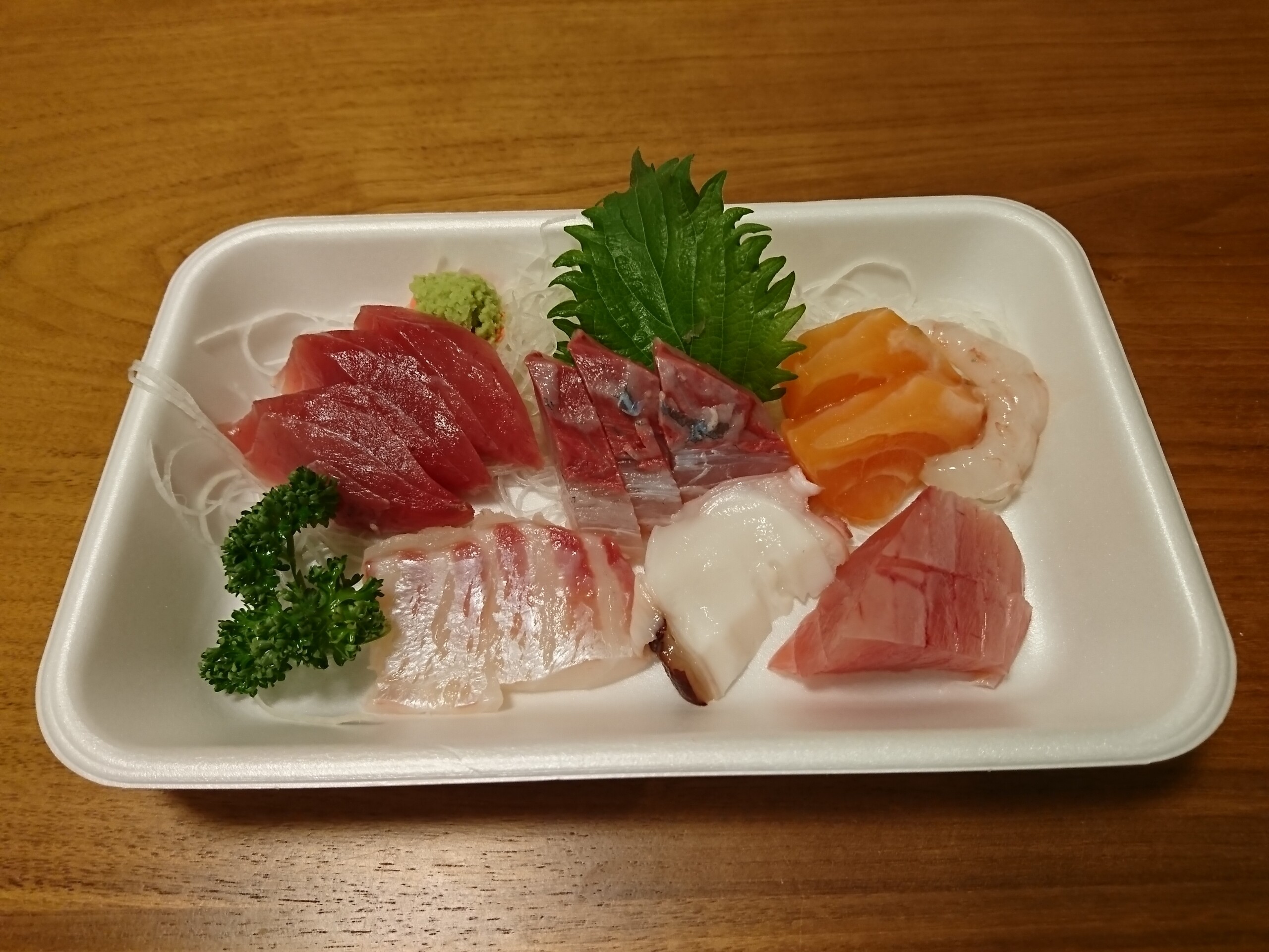 刺身盛合せ1人前(1080円)を買いました。盛合せはマグロにサーモン・カンパチ・真鯛の4種盛りでサーモンはまぁ普通でしたが、それ以外はどれも美味しく酒が進みました。