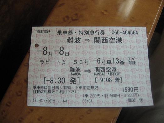 往きは、難波駅から南海特急ラピートで関空に行きまいした。全席指定でスーパーシートに座ったが平日の朝だったので、ガラガラでした。車内は高級感ある作りでシートもゆったりしていて快適でした。価格も1590円かなり安いです。